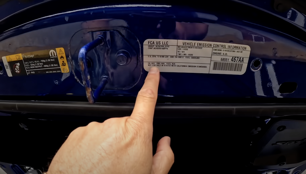 As one can see from the sticker located underneath the Hellcat’s hood, this particular vehicle is not intended to be sold in states with California’s emissions standards, which neither the new owner nor the selling dealer was aware of.