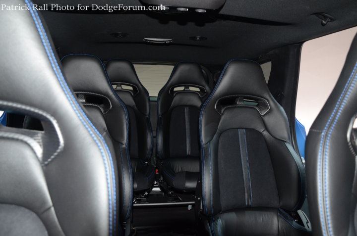 The Shaker hood design fits the short (relative to the Challenger) front end nicely and while I miss the crosshairs, the free flowing grille looks good when paired with the aggressive front fascia – which has an integrated splitter design and the air catcher headlights from the Challenger serving as driving lights. The 22 inch Mopar wheels over Hellcat Challenger brakes fit this SUV perfectly, with a performance suspension setup pulling the body down a bit tighter to the high performance tires. Out back, the Durango Shaker Concept has a lower fascia similar to the early SRT8 Jeep, with two huge exhaust tips right in the middle. Finally, Mopar added the B5 Blue and black paint scheme, the black Mopar fuel door and six carbon fiber race buckets from the Dodge Viper.