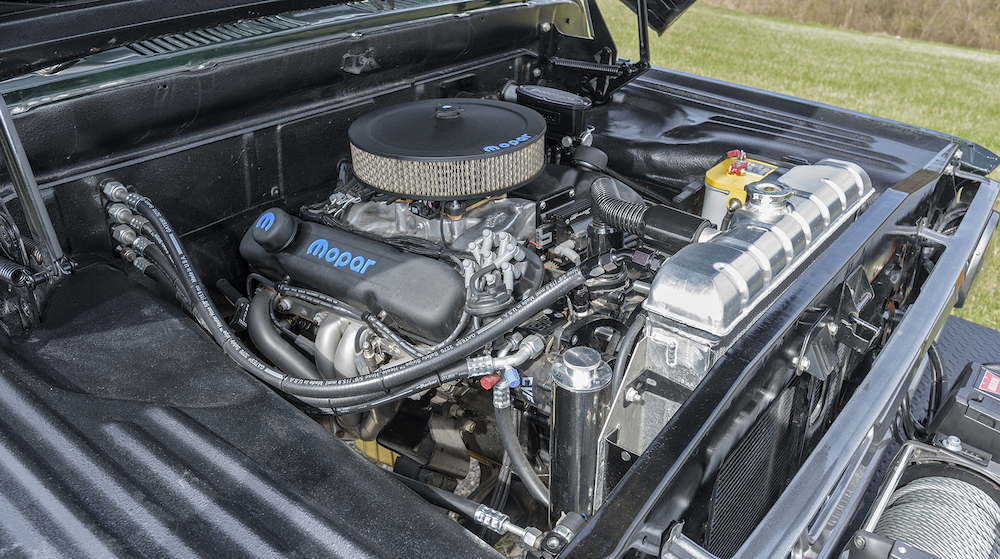 Pop the hood, and you won’t find some newfangled Hemi or even an old-fashioned powerplant, but rather, a mammoth 512 cubic-inch V8 that’s equipped with a Holley Sniper fuel injection setup, custom headers and exhaust, and an aluminum radiator with electric fans. That monster motor sends power to either the rear or all four wheels via a 700R4 automatic transmission and an Atlas transfer case.