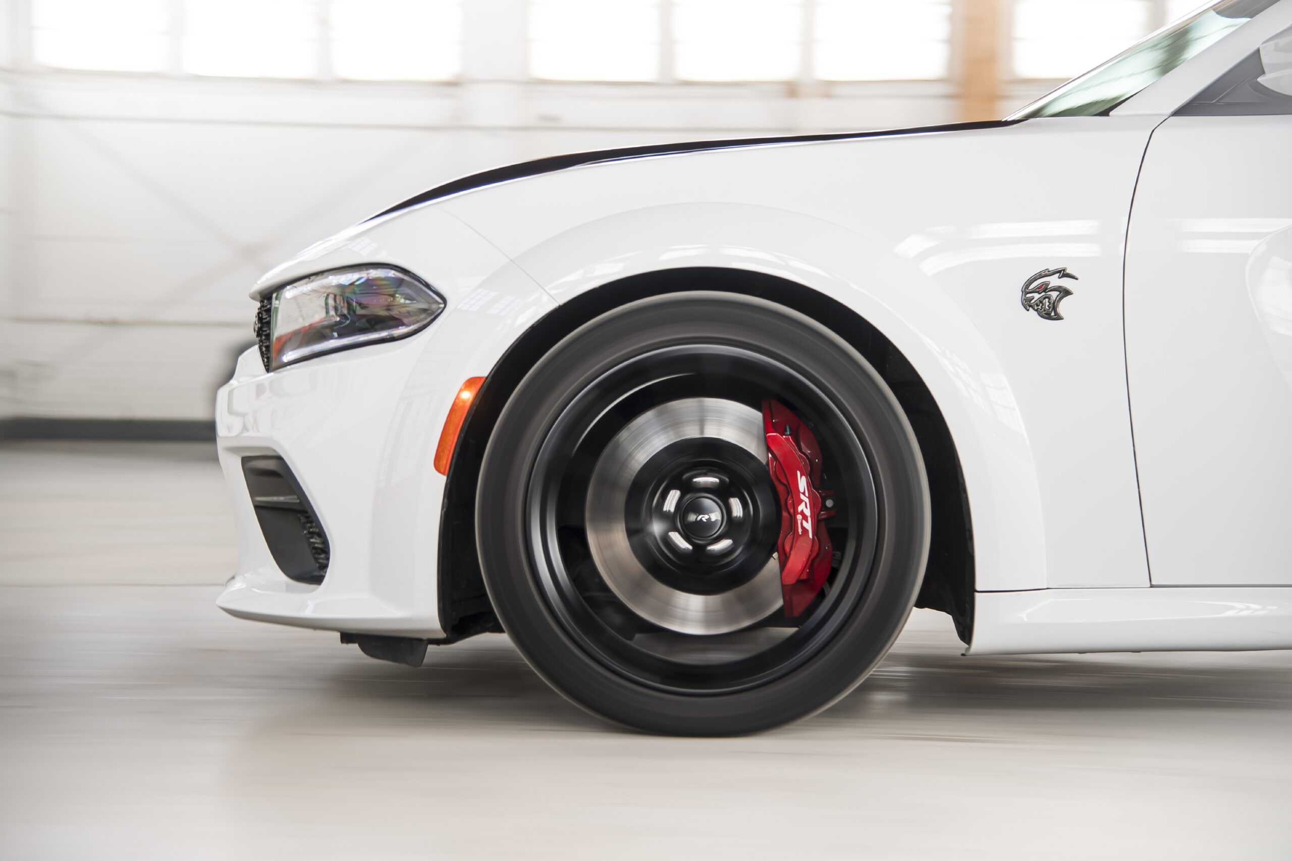 The Charger SRT Hellcat Redeye is unmistakably Dodge, featuring the aggressive, planted Widebody, standard, with 3.5 inches of added width paired with its wider wheels and tires. New, wider 20-by-11-inch Lightweight Carbon Black wheels ride on wide Pirelli 305/35ZR20 tires. The Pirelli 305/35ZR20 all-season performance tires are standard; three-season tires are also available.
