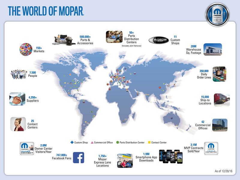 2017 – Mopar serves over 150 markets, offers more than 500,000 products and works to deliver a fully connected experience to customers around the globe.
