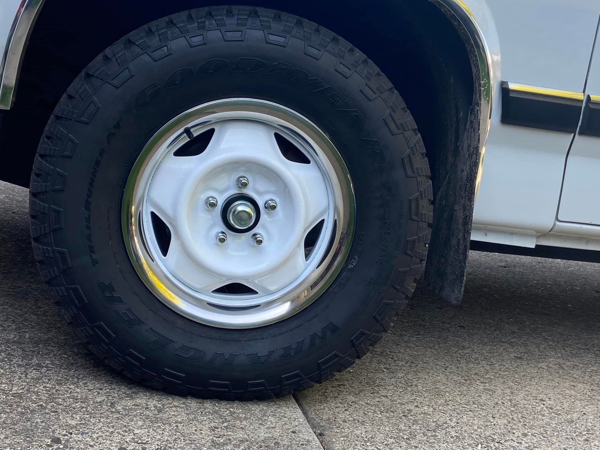 Thank you. I had a local guy sandblast the wheels (they were in pretty decent shape) and then another shop powder coat them gloss white. I painted the exposed ends of the hub in the front, added new dust caps over the bearings, then added the chrome wheel rings. I was looking at buying new wheels, but had this look in my head. I have right around $500 in the entire project.