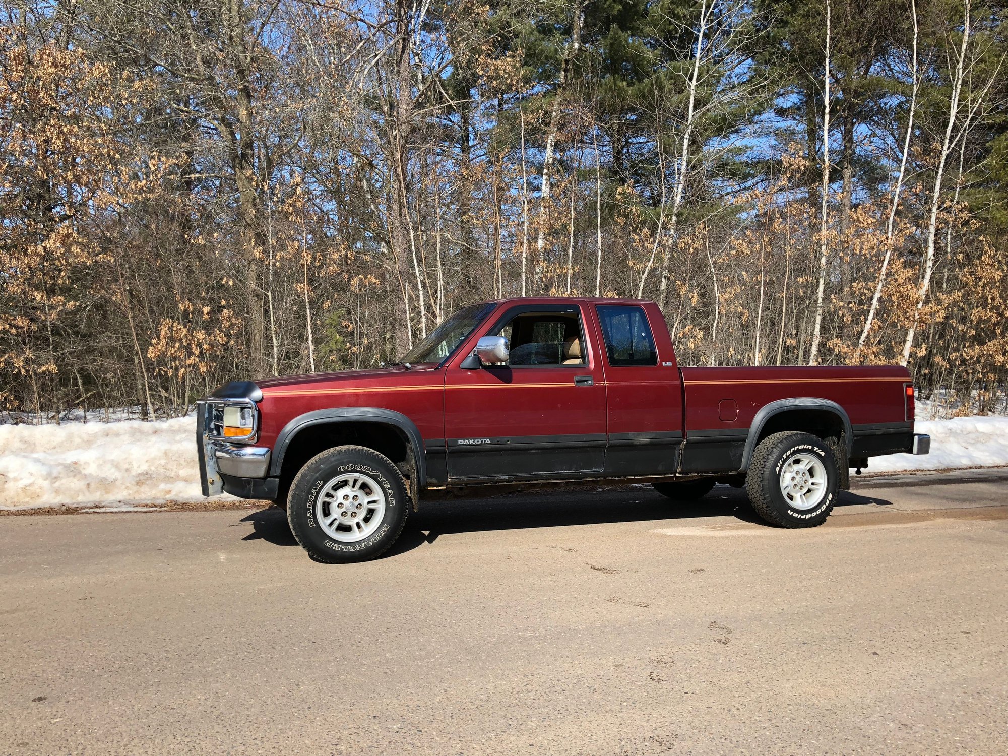 then a 94 shortbed (nother V6 but this one was a Magnum) ran it the shortest time of any Dakota I had, had it about 14k miles, had paid around $1000 in 2010ish, sold it for $500 to a buddy of mine because that was all I needed to buy my 93 318 clubcab.... my buddy is a dealer trans guy.... and both the 94 and my "new" 93 had bad trannys at the time.... I put a 5 speed in the 93 and ran the wheels off of it for 72k miles.... loved it, plenty of ba11s, V8 and 20 MPG on the highway, regularly 18-1/2 MPG in daily driving...... I wrecked it BAAAAAD so it had to go... had around 202K miles at the time it got wrecked....