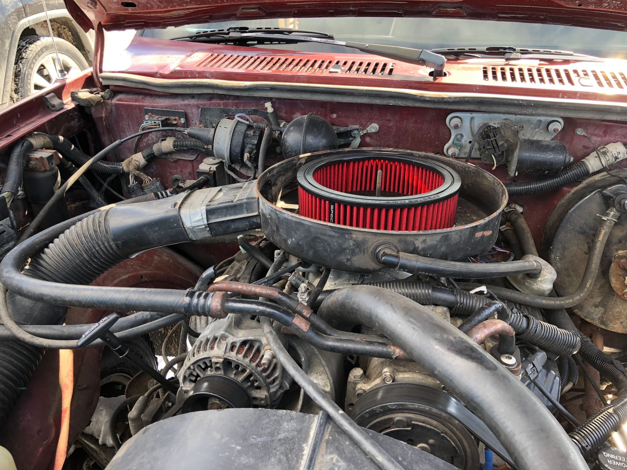 The day that I brought the 92 home, I went to the junkyard that my wrecked '93 had been taken to, and bought the Class 3 hitch from it that I had recently bought, the then- brand new drums, and a few other parts that I had recently put onto it before the crash and put those onto my 92 gradually, over about a month..... came out with a couple of armloads of parts the yard had charged me $40 (I told them these came off of my own truck that was brought there 3 days before) they gave the tow truck guy $200 for it which I had split with him..... I then stopped by the parts store and bought a cap rotor plugs wires and all belts and hoses, those I put on the very day I bought the truck, right off the bat "no matter what" the old stuff looked like. 3 days later my wife and I took off for Branson, in that 92, was our 25th anniv, a trip we had planned a month before I wrecked my 93.... 8 hours there, 8 hours back a few days later without an issue.