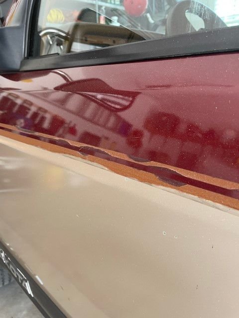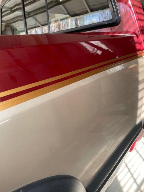 Removed pinstripe from the left side. Decided I'm gonna give the middle paint section some new paint using rattle cans. It's chipped and scratched up pretty good. Just the tan mid section from the door back. The rest of the truck paint is fine for the most part.
