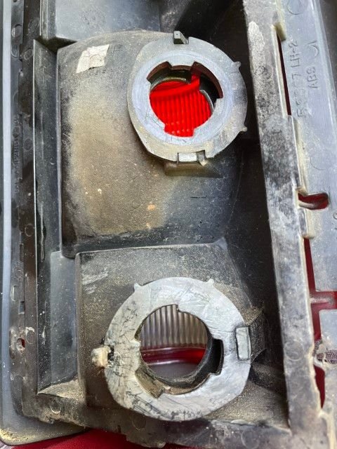 You can see the lower socket (for reverse light) is missing the attachment collar (first pix). Upper socket for tail lights is in fine condition and shows what it should look like. Goes in the lower hole in second pix.