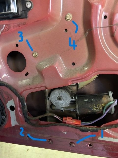 The four bolts securing the power window assy. Remove 1 thru 3. Loosen #4.
