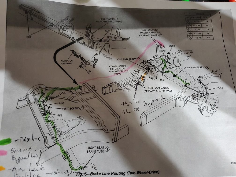 The brake proportioning valve I am not seeing. Keep in mind I replace the lines but followed the original layout. So today, I plan to trace the lines, confirm layout front to back and double check everthing. Honestly I am not ruling out anything as the previous owner rigged a few other things...why not brakes as well.