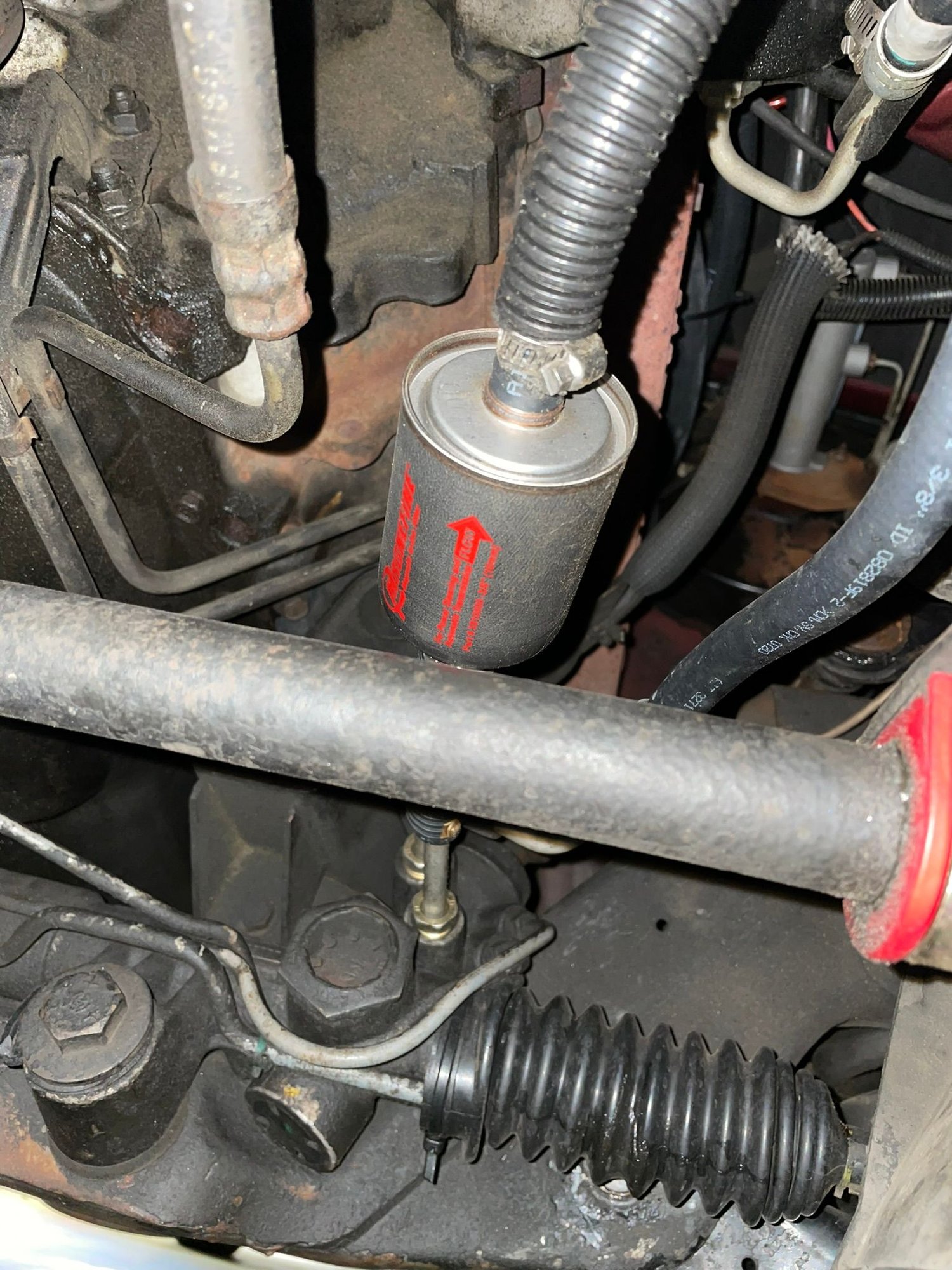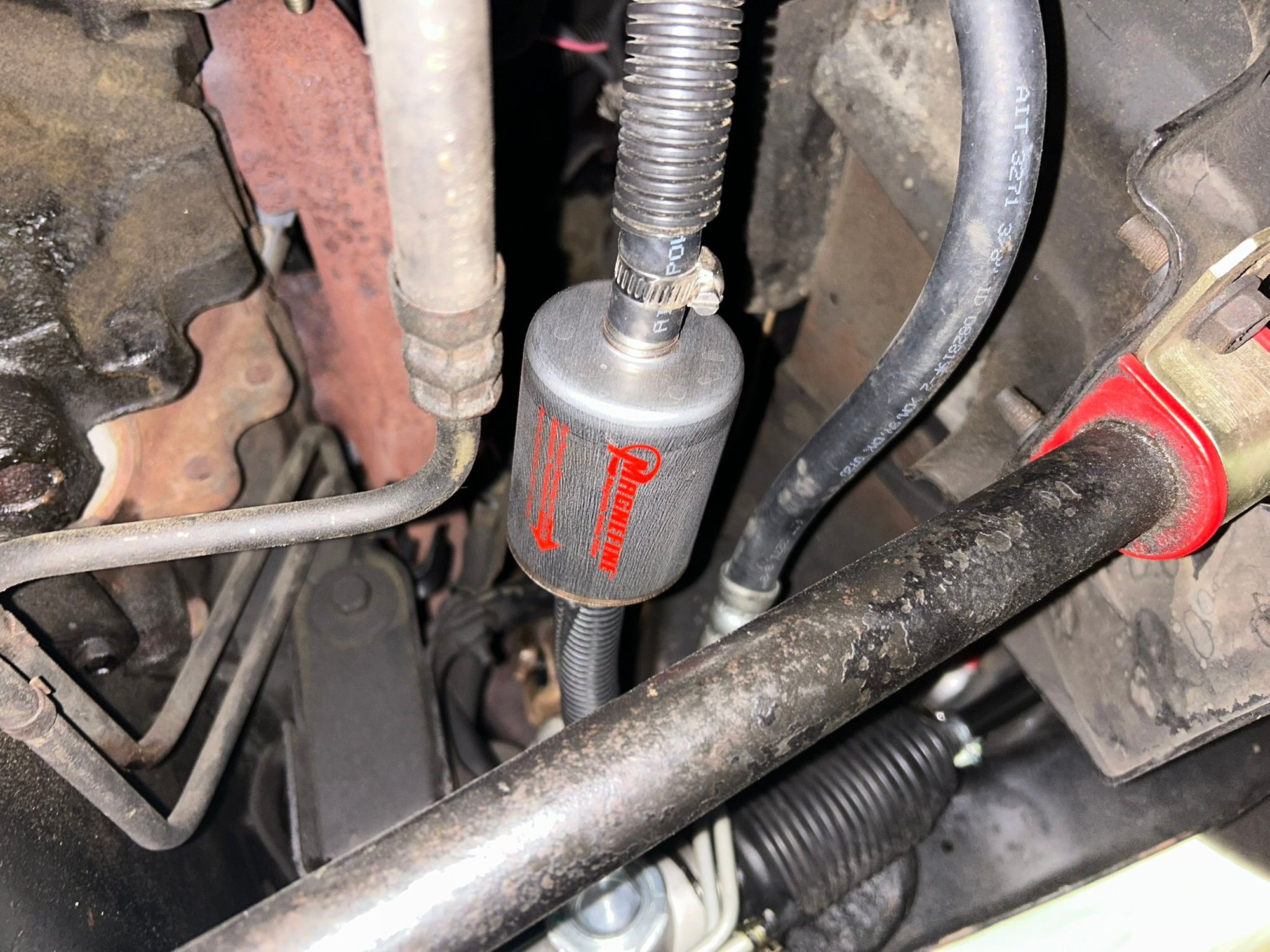 I just had my rack n pinion and steering shaft replaced by my mechanic in my '93 Dakota RWD. When I got it home I took a hard right into my garage and felt/heard a pronounced shimmy/stutter. I had the mechanic install a new filter and suspect the guy put the filter on in the wrong direction so I took a look. Three years ago I added a Magnefine magnetic inline power steering filter. The filter must be installed on the return line and the P/S fluid flow must be in the same direction as the arrow on the filter canister. See picture 1.