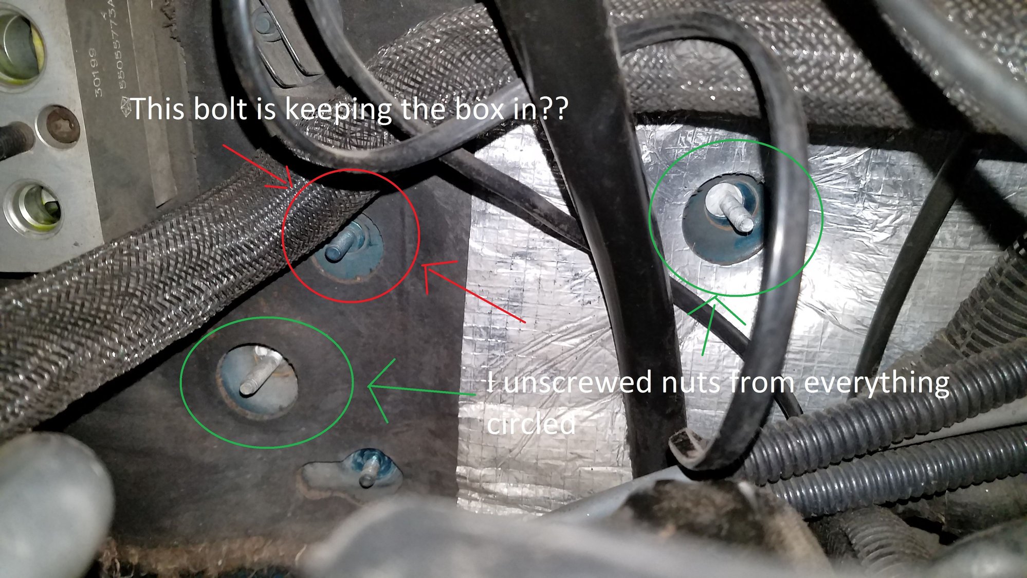 It's been about 4 years since I had the hvac box out of mine. But if I remember right there were four nuts for the box. But the one circled in red doesn't look like a stud that's for the ac box. Looks more like a ground lug or a mounting point for something in the engine bay. There should be one more silver stud with a nut on it holding the box in. If I remember right, it's like right behind the intake manifold. Real PITA to get to. But like I said, it's been about 4 years, so...