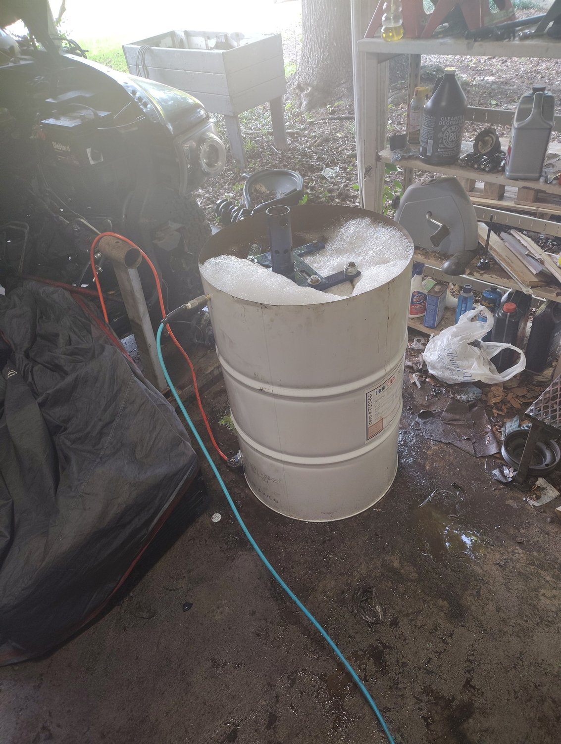 So after many house of cussing trying to find that stray bolt holding everything in the engine was out ready for rebuilding. Got everything tore down to the bare block, and got everything ready for my home made hot tank. It was real simple and cheap to make. It consisted of a old steel drum, an low watt water heater coil and a heavy duty electrical cord, and a few steel blocks on the bottom to make the engine parts don't crush the coil. Throw in two gallons of formula 88 and fill with water and bake all the crud away!