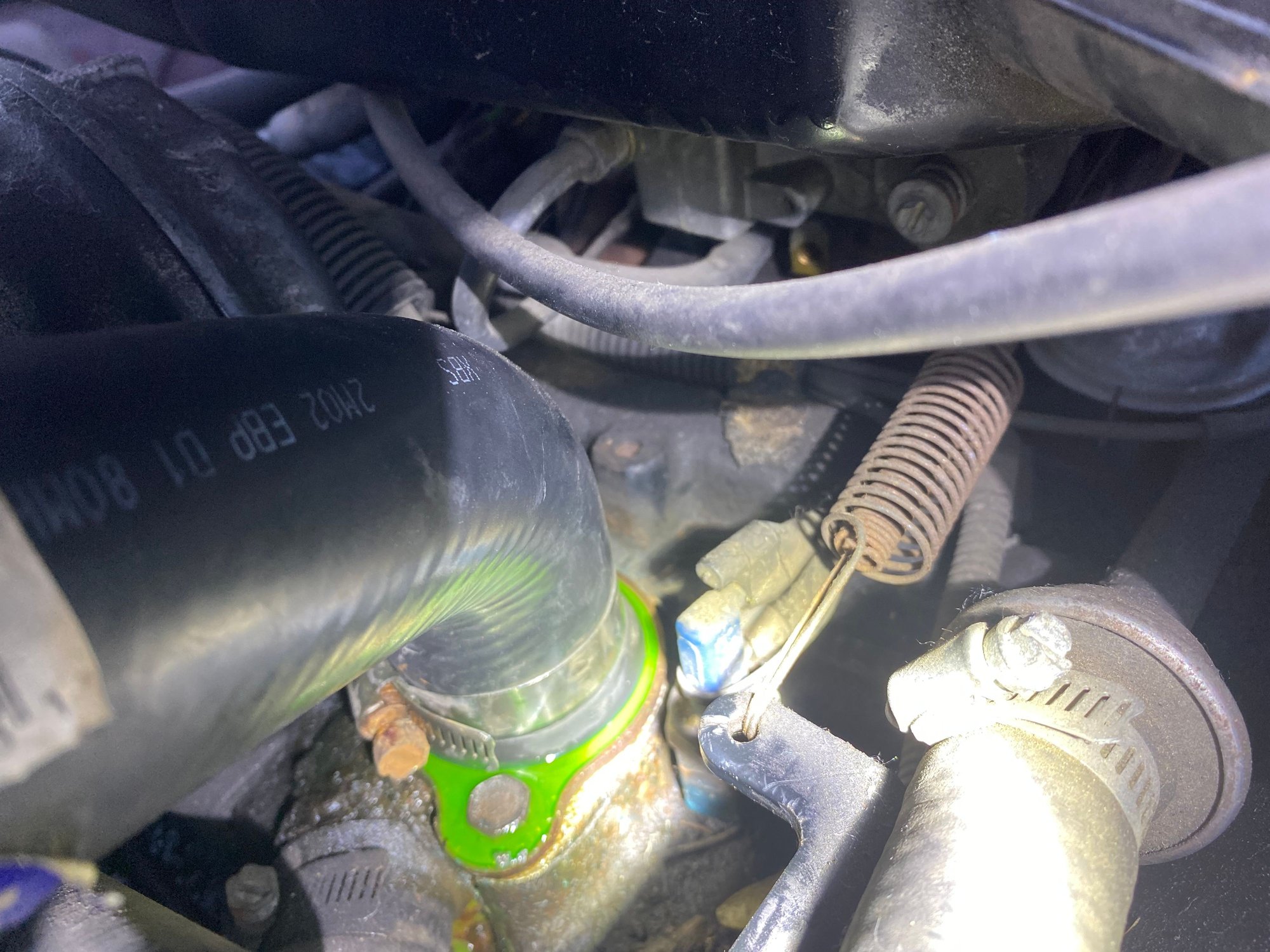 Today I installed a new thermostat housing to try and fix this leak. I thought this was my problem because the old housing was very rusted. However, the leak came back!! It looks like it’s leaking between the hose and the housing. The clamp is tight.