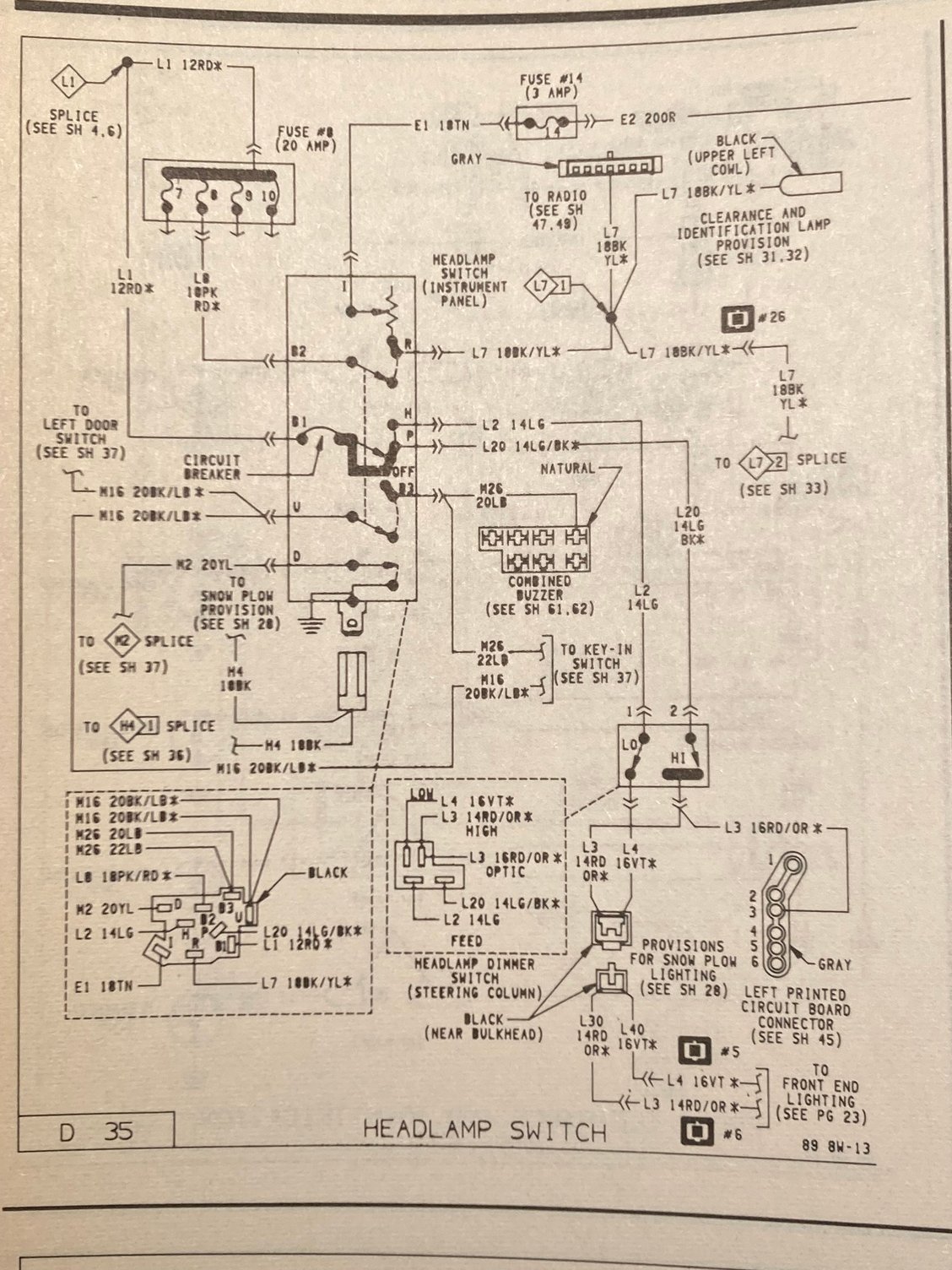 Headlights 12v hot on blue wire which is b3 ,pull **** out 2 notch and b3 makes contact withe U which is black blue wire. Now here is the conundrum , i placed a jumper wire from B3 and U and pull **** to 2nd notch and lights came on. Yeah . Now the hi beam circuit works fine.. Why? If a cuircuit breaker is inside switch why would bypassing this make it work like normal. But P is always hot and is green black and energizes H which is green. This truck runs lights thru multi function turn signal.. I also used hayes 12-31 page at the back of book and 12-7.