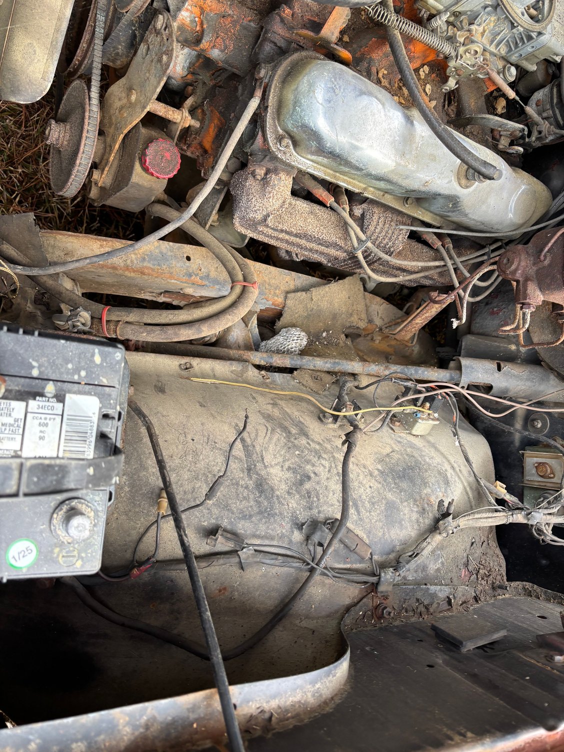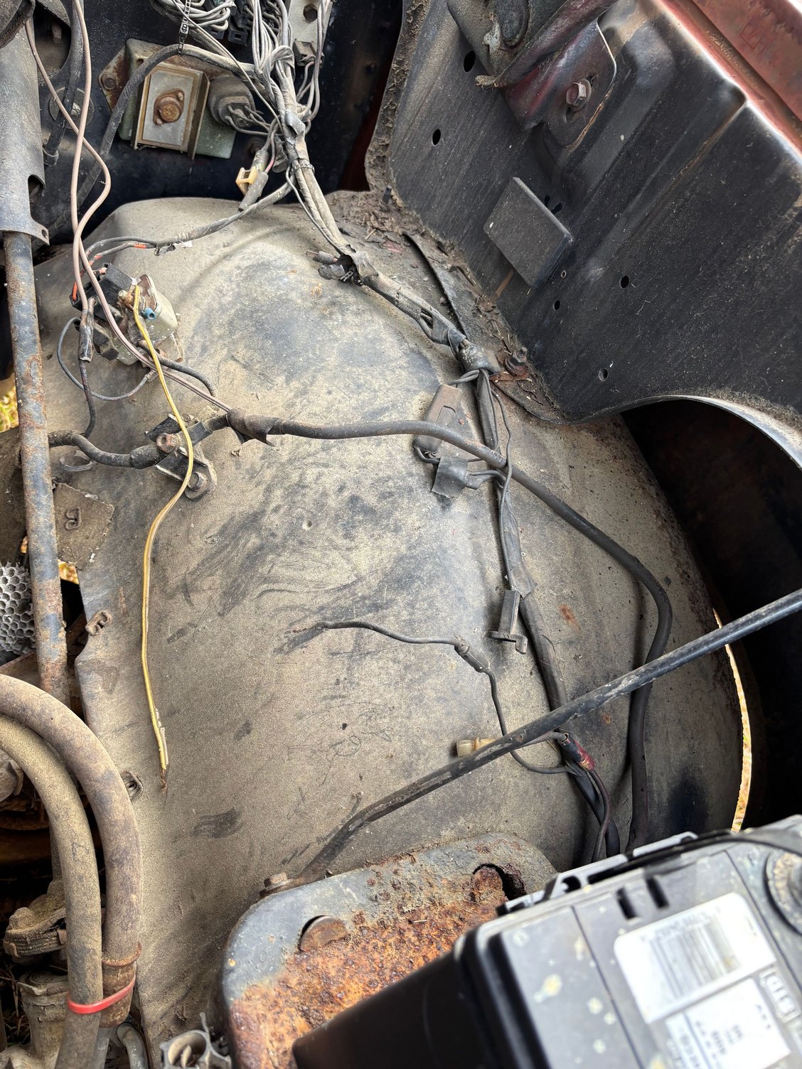 I was told it runs, but it’s been sitting for a while. The engine spins freely, the oil is black but not low, and the radiator is full of coolant. I hooked up a good battery, but when I turn the key literally nothing happens — no lights, no crank, nothing. The wiring in the engine bay around the ignition and electrical harness definitely needs attention.