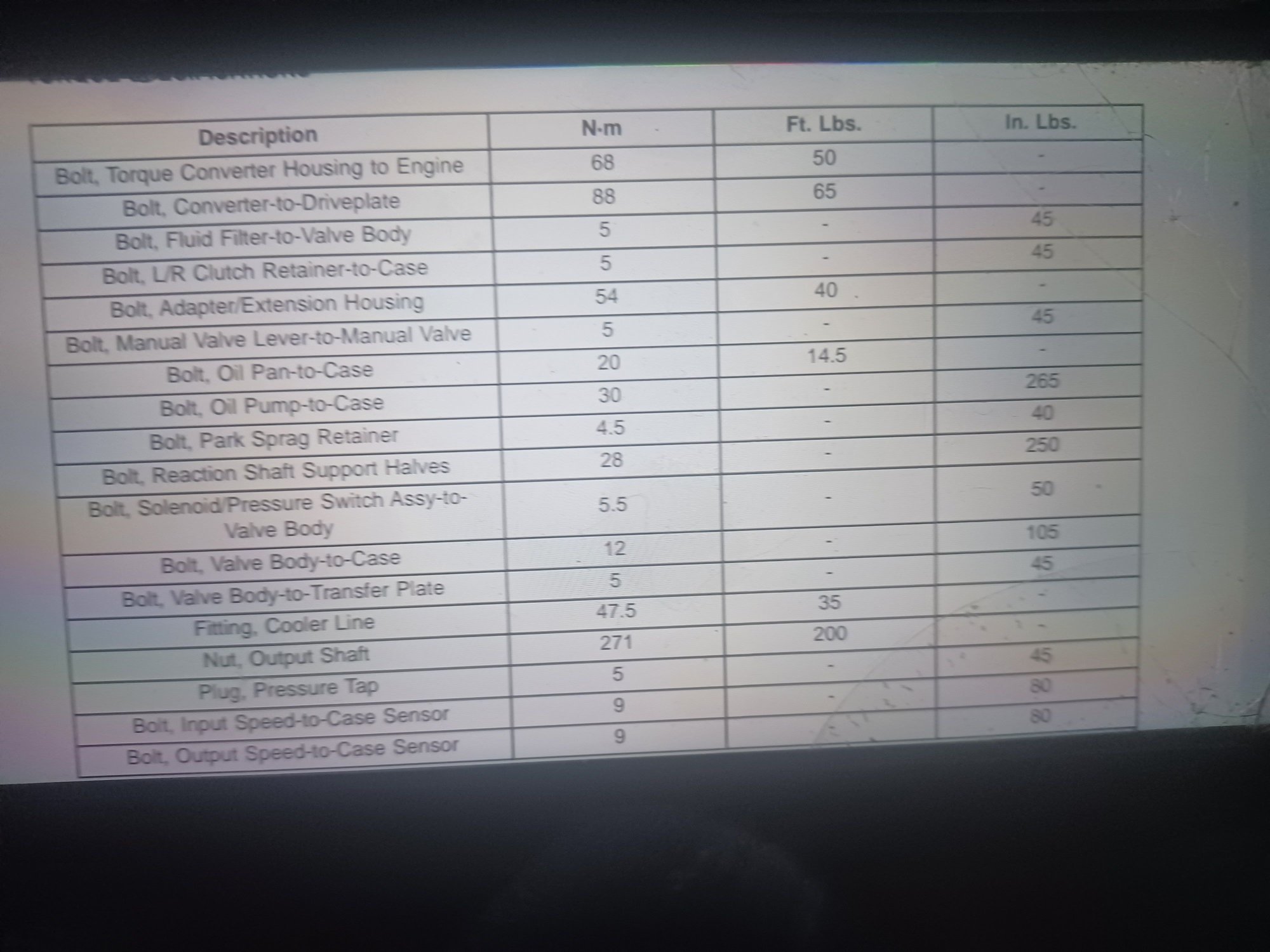 Do you know the ft lb on the 4 11mm bolts an the 2 hex screws holding the part that the shift solenoid sits in?