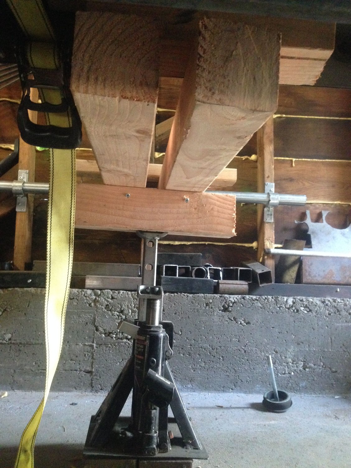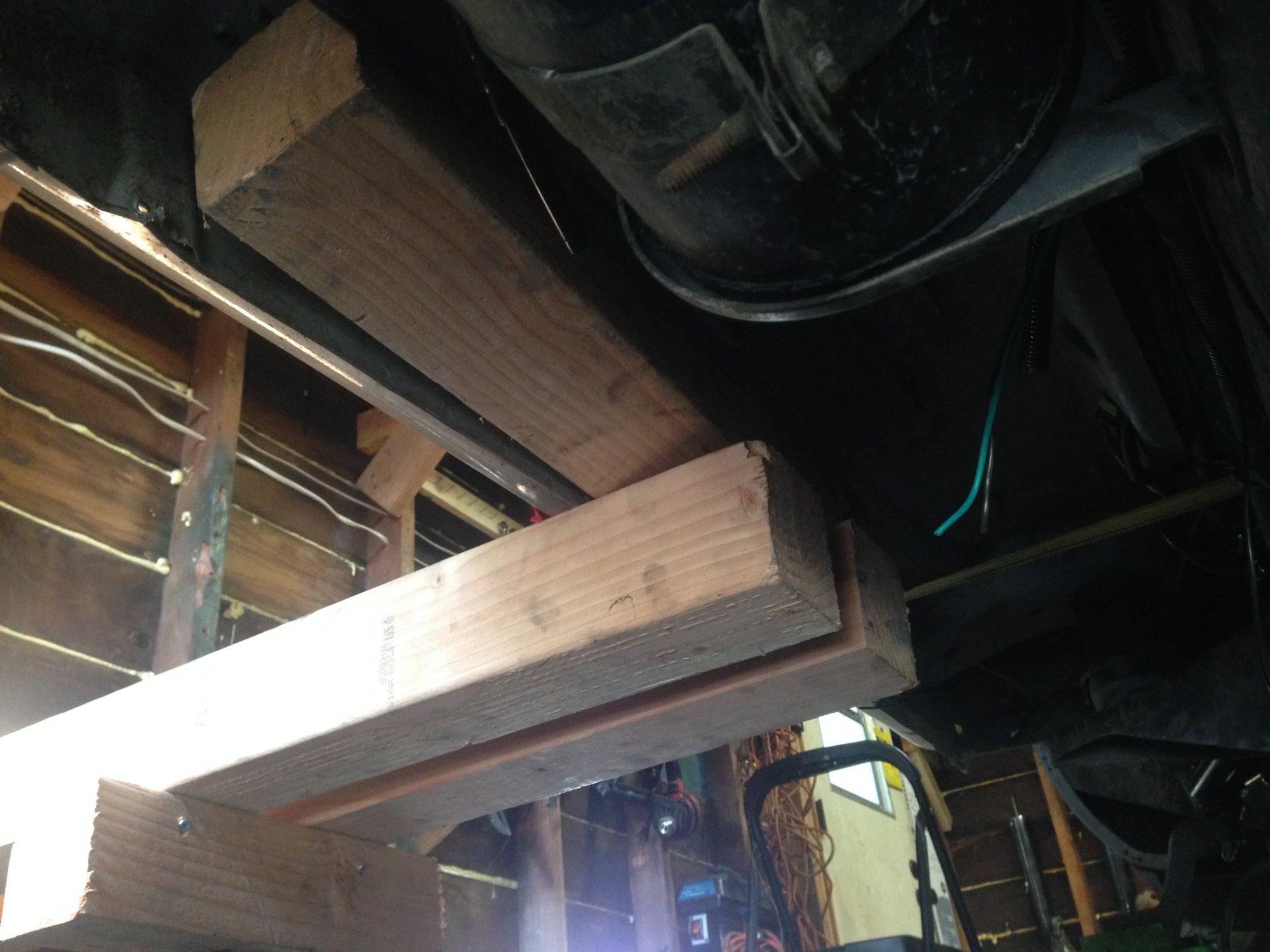 Once the truck was snugged into the garage the next step was figuring out a lift system. I figured it would be easiest to keep the body and engine compartment together to minimize the amount of disconnecting, but if I simply jacked up the body i wouldn't be able to simple pull out the old frame like I planned. So I rigged up a wooden 2 post lift contraption with 4x4 posts, steel fencing rail, some brackets and a bottle jack.