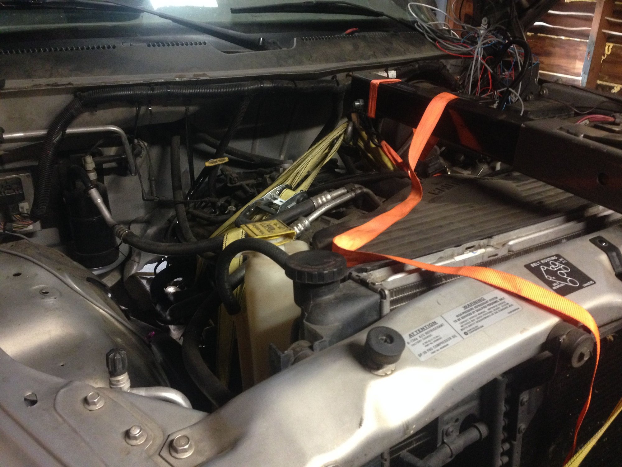 Engine securely supported by 2 heavy duty ratcheting tie downs. As well as front end.