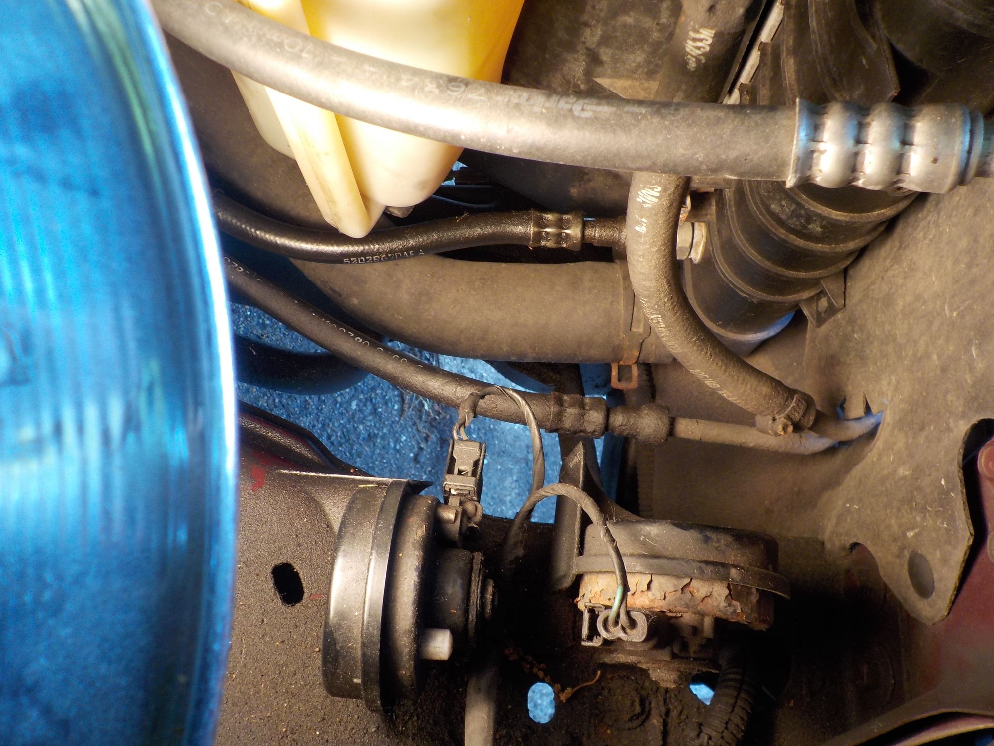 its leaking where im pointing . notice at end of steel line the line has a ring that the rubber line fitting butts up to . and at oreilly and autozone they dont carry thee exact rubber hose to replace this so im wondering if somebody could provide me a link to the part i should buy ... i can buy that top line in the top photo , but not the bottom line ...