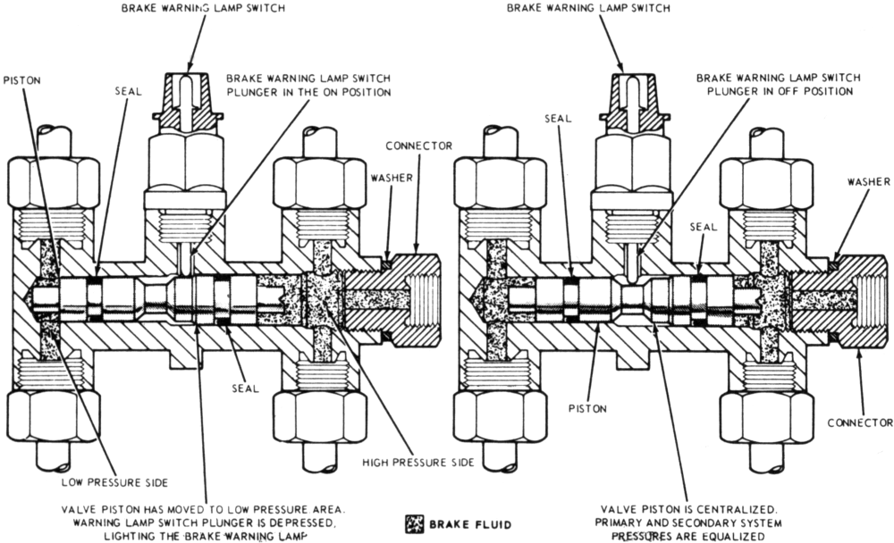 The switch looks for pressure differences between the two branches of your braking system. When it detects an issue, it activates. It's actually a very simple valve that sits between the two branches. The pressure difference pushes the valve one way or another, and if the difference is great enough, the valve makes contact and completes the circuit. It's a pressure switch basically.