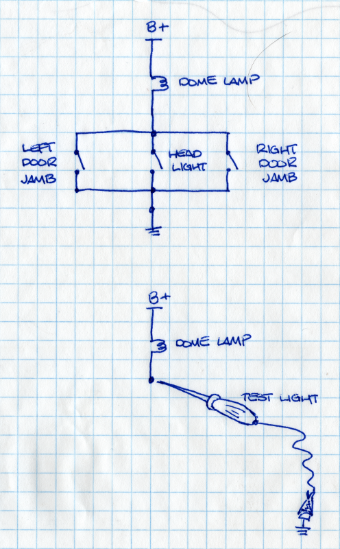 With the fuse OUT the power (positive) wire TO the dome lamp still has full 12V power. The ground wire ALSO has some power backfeeding into it and lightly illuminating the test lamp. This was determined by REMOVING the bulb and connector and probing the two wires directly at what would be a dead-end for power, so no other bulb (besides the test light) was involved and there was not power flowing through two bulbs like you suggested in your drawings. Also I did not pierce the wire insulation, but tested by touching to the end of the connector where the bulb and connection would normally be. The test light was grounded directly to the truck battery for this.