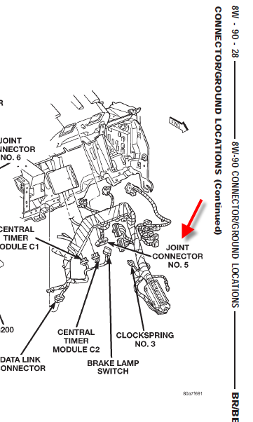 2000 Ram 1500 5.9L. I've isolated a short down to the radio power wire (continuity with ground at the head-end connector). I'm trying to find Joint Connector No. 5 so I can start tracing the wire, but I can't locate it. I've seen Fig 24 on page 8W-90-28 of the 2001 FSM but it's not helping me. It looks like it should be just higher and slightly to the driver side of the brake lamp switch, but there's nothing there. Not sure if that's a difference between 2000 and 2001. Any tips? I tried following the loom, but it almost immediately goes into a plastic/vinyl conduit that goes down to the driver footwell and left over the cluster.