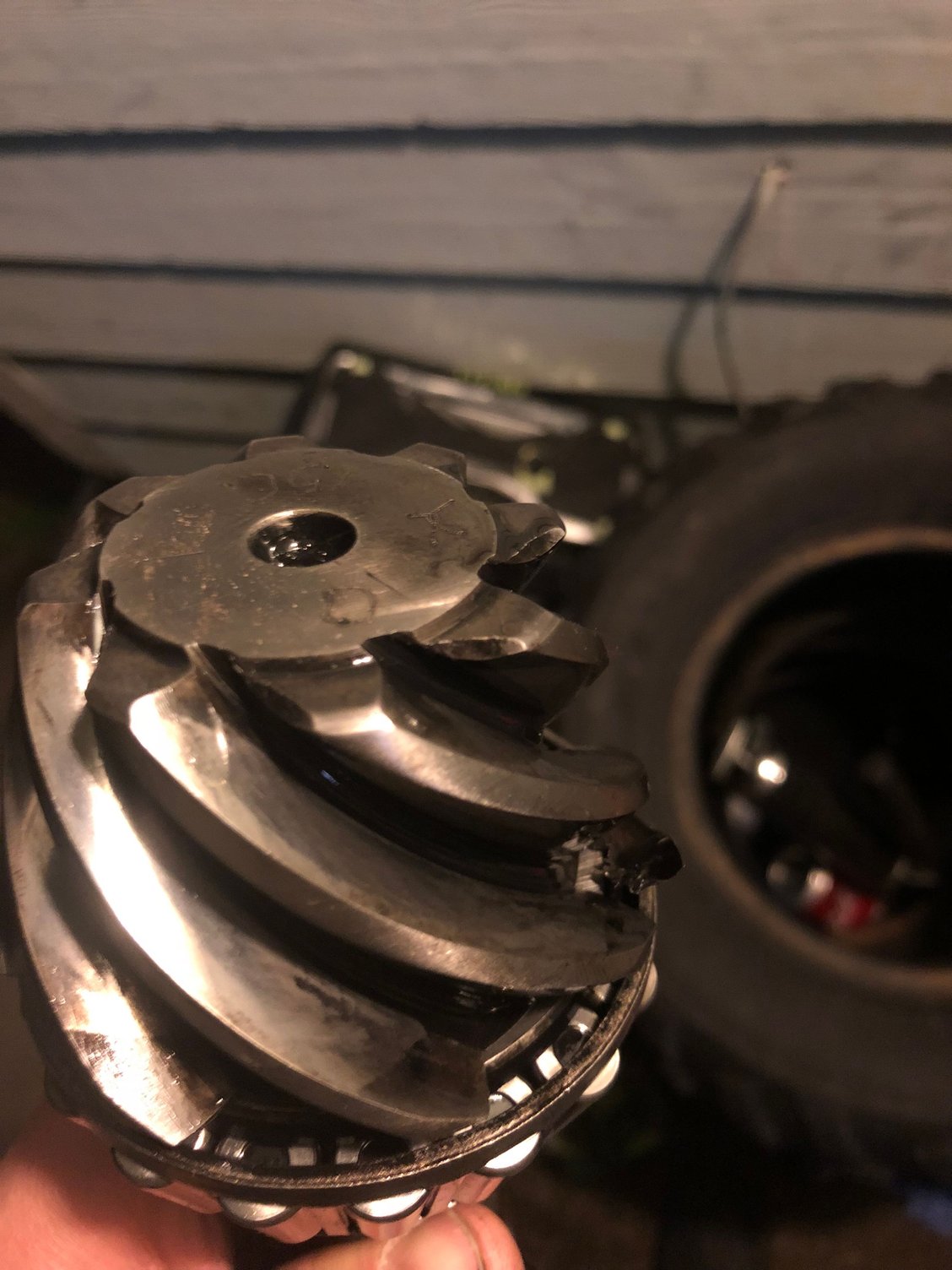 Thin piece I found. Same piece in other photos Chipped gear on like 5 splines Pinion gear with the meatball piece sticking out (bottom right corner) Thin piece in the center of gearI had a howl coming from the rear end so I pulled the diff cover an found this piece is metal inside. An the yolk that connects to the drive shaft, you could wiggle it up an down. I don’t think your supposed to do that?