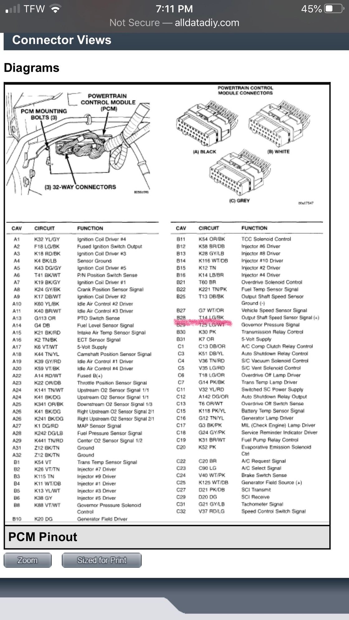 alldata shows this wire as being “B28 output shaft speed sensor” with everything plugged in I get no reading to the b28 pin from the pin85 at the PDC