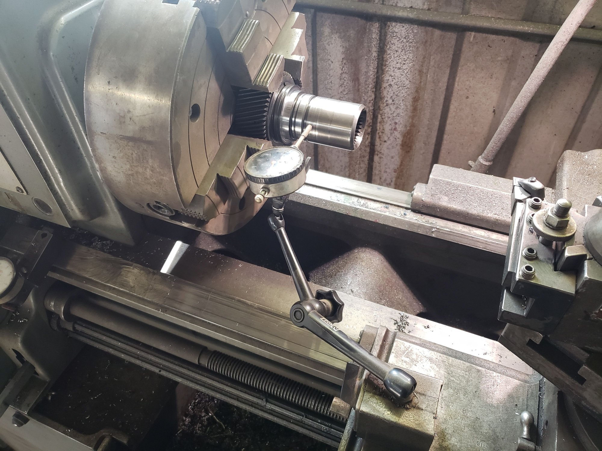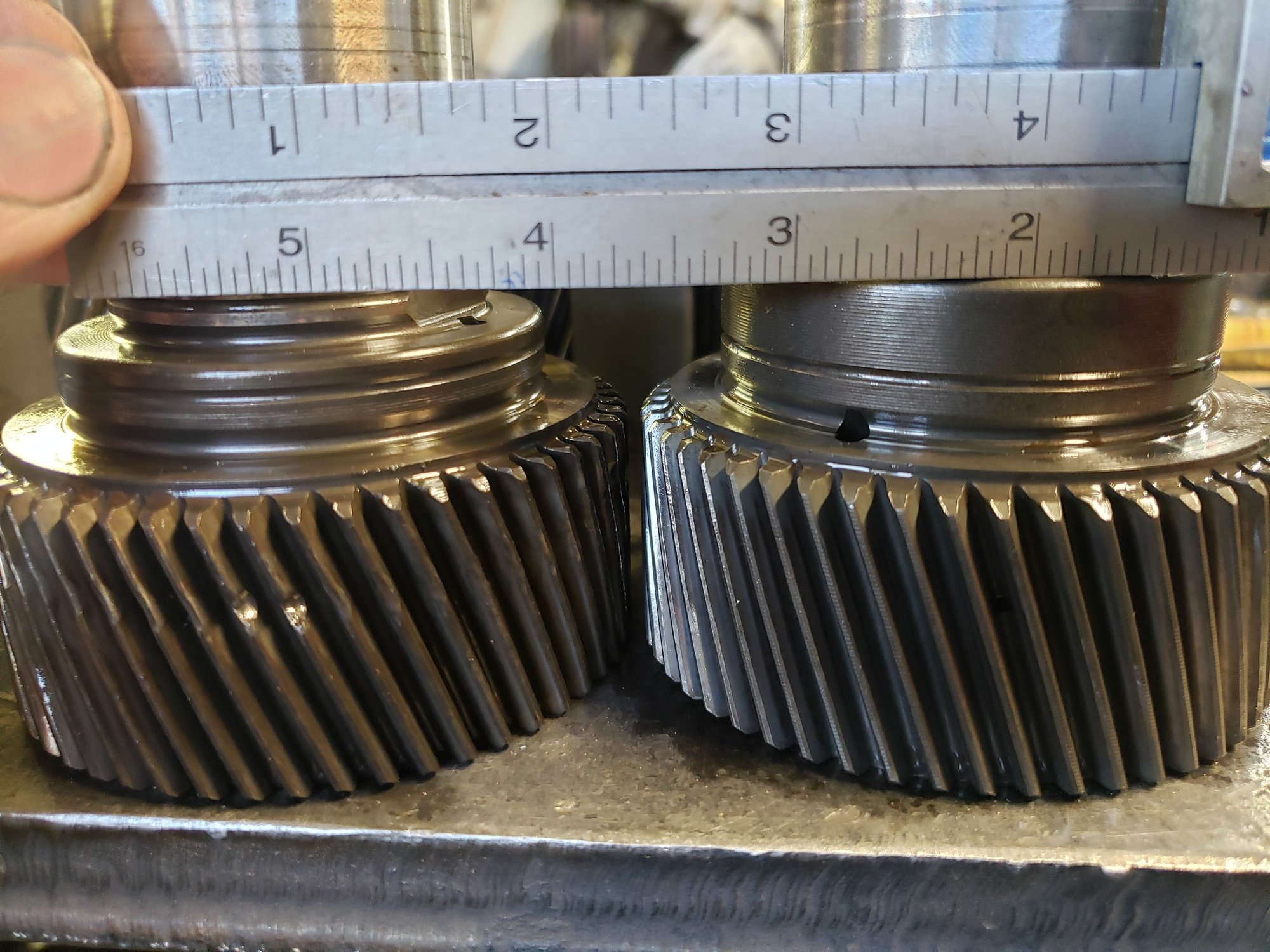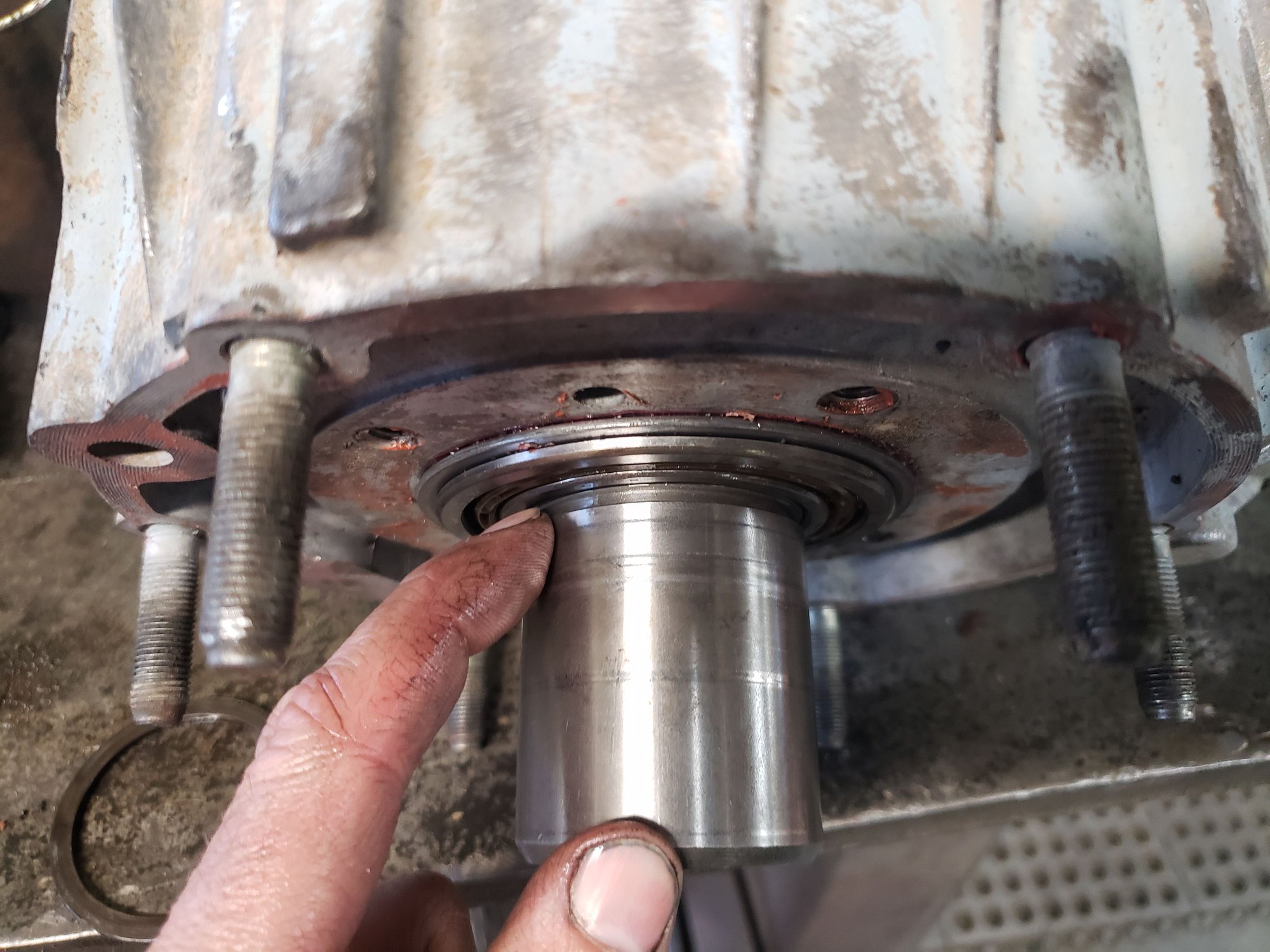 It's also perhaps important to note that I had read somewhere (I kinda think it was cumminsforum.com) that you could simply upgrade to the double row bearing with nothing else. This isn't true. This was the munched sun gear from our $500 "front input bearing processor. " It was the newer style to accept a double roller but I wasn't comfortable using it. Newer double roller style left, older single roller right. The difference is .3125" or 5/16" because the single is 5/8" wide while the double is 15/16" I'm stubborn, so let's swap on the 4-jaw, indicate it in to .001" TIR and turn back that shoulder (I went .310" based upon measuring existing parts) Factory had a small radius groove right up against the shoulder, presumably for oiling, so I did one, too. I was too lazy to grind a true radius so I used a parting tool and just went shallow. I was concerned about creating a stress riser without a heavy radius, but whatever..... Finally, I duplicated the flat at the oiling hole My freshly modified shaft right, now ready for a double roller input bearing If you don't do these mods or use the correct piece this snap ring groove will be buried within the bearing 5/16" back and your entire mainshaft will sit 5/16" too far to the rear -- not sure the case halves would even mate this way but I wasn't gonna find out
