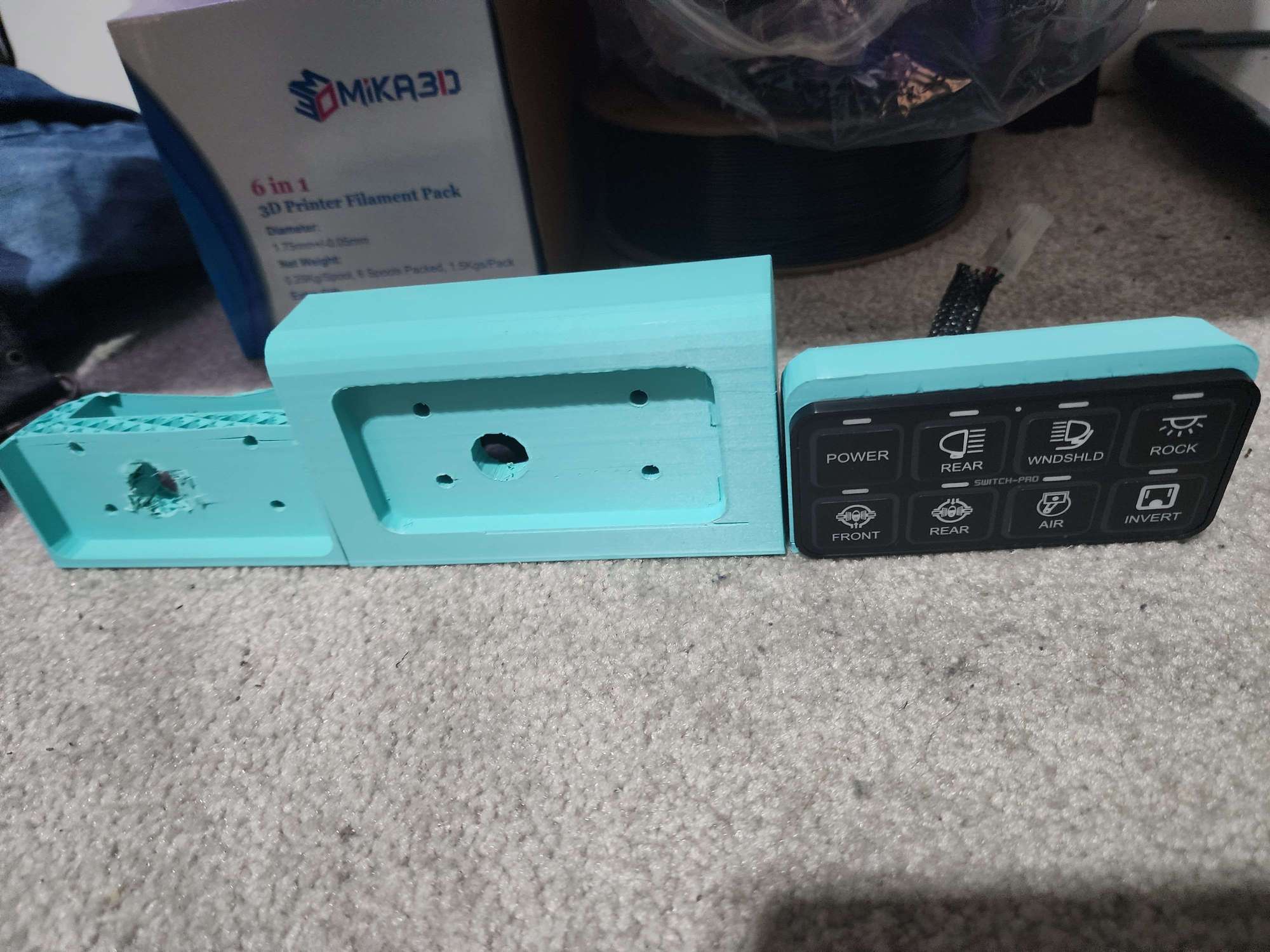 I run two Switch Pros SP9100 Switch panels in my truck to control my On Board Air, Off Road lights, etc. Nobody makes a mount for the second gens so I designed and 3D printed one. In the photos with the 3 different mounts going left to write are my renditions. 1st printer messed up, 2nd was to big, 3rd is just right on my opinion. Will redesign it once my 3d scanner comes and I scan the dash to have the right curvature. I made it rolled to kind of match the dash. It will be reprinted in Agate ABS one I scan the dash. I left the bottom open to get to the nuts and even cut out a half circle for the harness to pass through. I'll use either double sided tape or velcro to attach it to the dash. Any opinions are welcome!