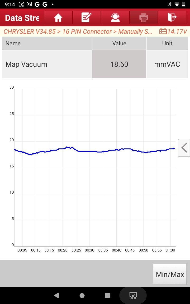 BTW times are not accurate in the photos. From time 0 to 1:30 I was having to pump the throttle to keep the truck running. From 1:30 to 2:25 my foot was off the throttle. I then did the screen shot and somehow backed out of the diagnostic program. Once I reloaded the program, I took the second screen shot that shows steady MAP Vacuum