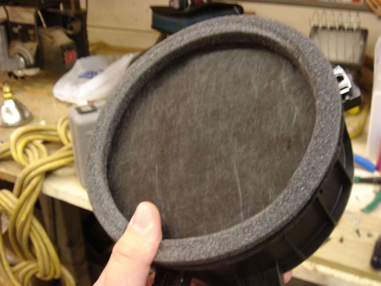 As you can see in the picture I also rounded off the side I drilled the hole on. This will be going on the speaker and you don't want any sharp edges sticking out that might puncture the rubber surround. Next place a bolt through the hole in the bracket you've just made and place it on the speaker: