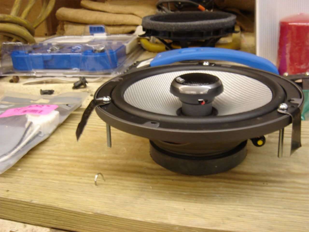 I recommend doing two of the three brackets for one speaker, then screwing them down temporarily and doing the third to ensure a good fit. When you have all of them drilled mount the brackets to the speakers using small bolts and a nut on the back, then place the speaker in the factory bracket. Don't forget to put the gaskets that came with your speakers in-between the speaker and the factory bracket. Now screw the brackets you made into the factory bracket using the screws you took out before.