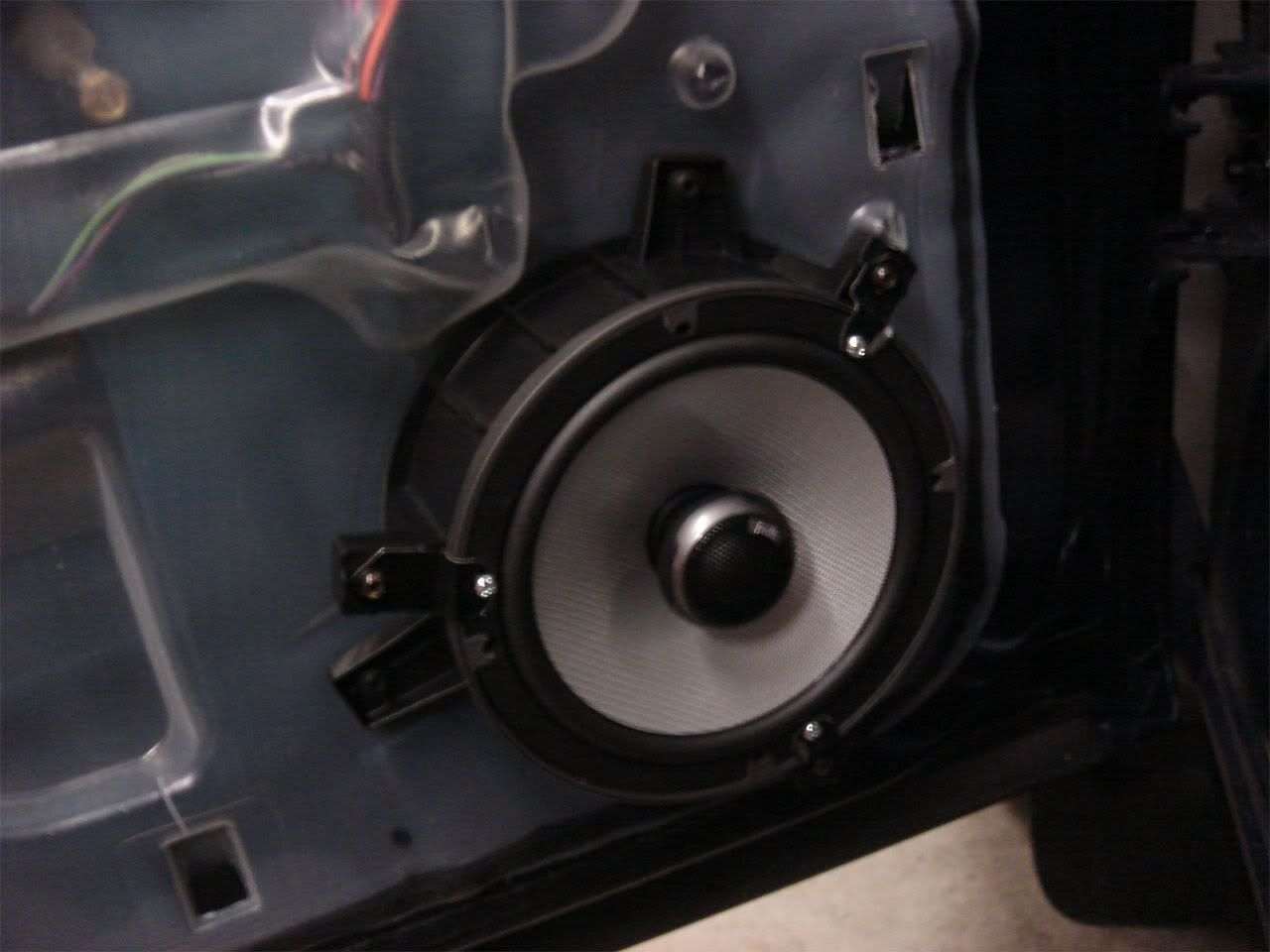 Now all you have to do is plug them into the factory wiring, screw the factory brackets back into the door (one of them has a little nub sticking out that matches the door, they only go on one way), put the panel back on and enjoy your new speakers!