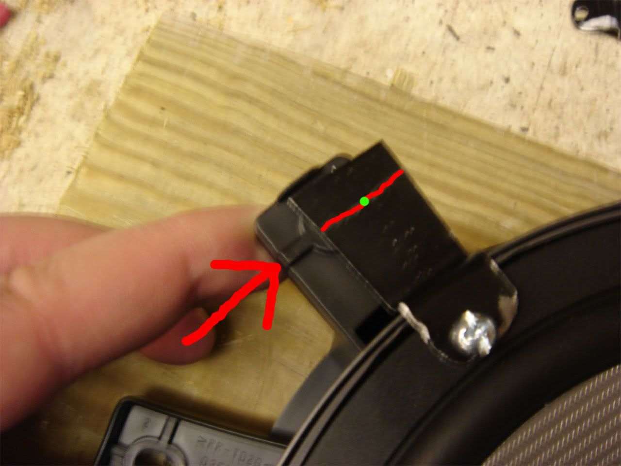 Now that you have the brackets bent correctly all that's left is to drill the second hole that will match up to the hole on the factory speaker bracket. Put them on the speakers again and set the speakers in the factory brackets. Notice that on the factory brackets there is a raised line going across it where the hole is. You want to draw a line on your bracket that matches that one, then drill in the center of that line. See the below picture if you're confused (drill where the green dot is, red line is where you should draw your line):