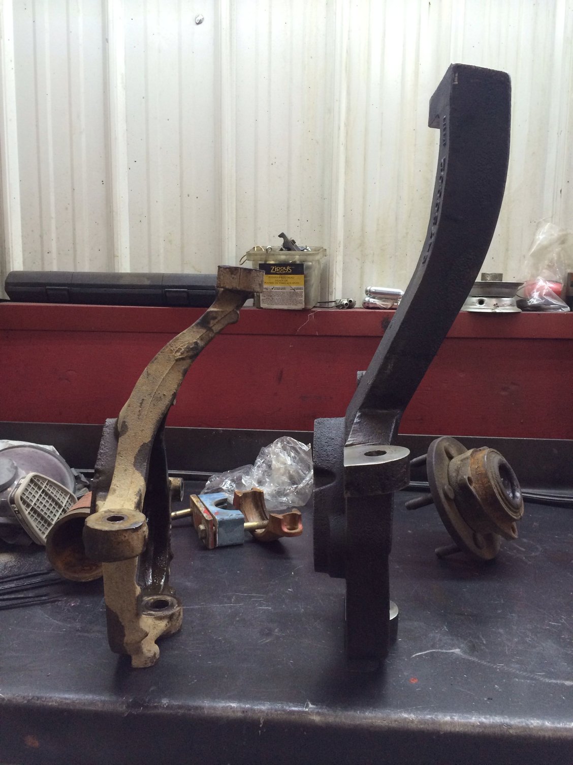 Ok so I've made some progress today, I've basically gotten the entire front end stripped except 1 seized control arm bolt I'm gonna have to cut but I'm gonna hold off till I know I have a replacement. I compared my new knuckles with the stock Dakota knuckles and they look like they're going to work, only major issue is the tapered mount spots on the new knuckles are deeper than on the Dakota knuckle so I'm going to have to machine them down so the ball joints fit properly. I was hopeing that the front diff drop brackets would all be the same but after getting the diff out of there I see now every bracket is going to be different. I also discovered one of my sway bar links snapped and was rubbing on my CV boot and it tore off and filled it with rocks and dirt so I'm going to have to replace atleast 1 CV now. Hopefully I'll start designing drop brackets and get them made sometime this week. That's all for now.