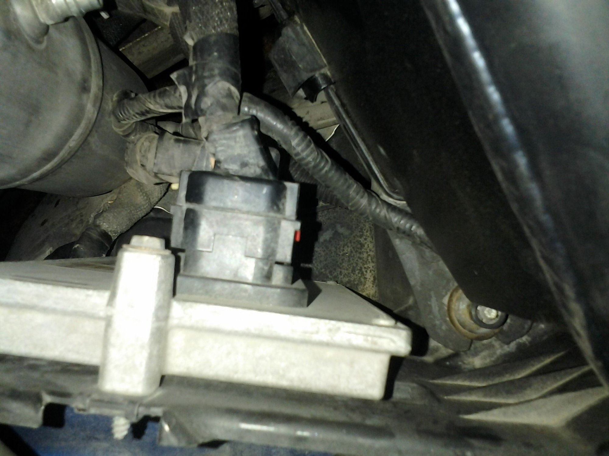 The first connector I believe is your ac condenser or clutch or it goes to your air temp sensor. The second connector that looks like it comes from the front bottom is your fog light connector and that container under your driver seat is your evap canister
