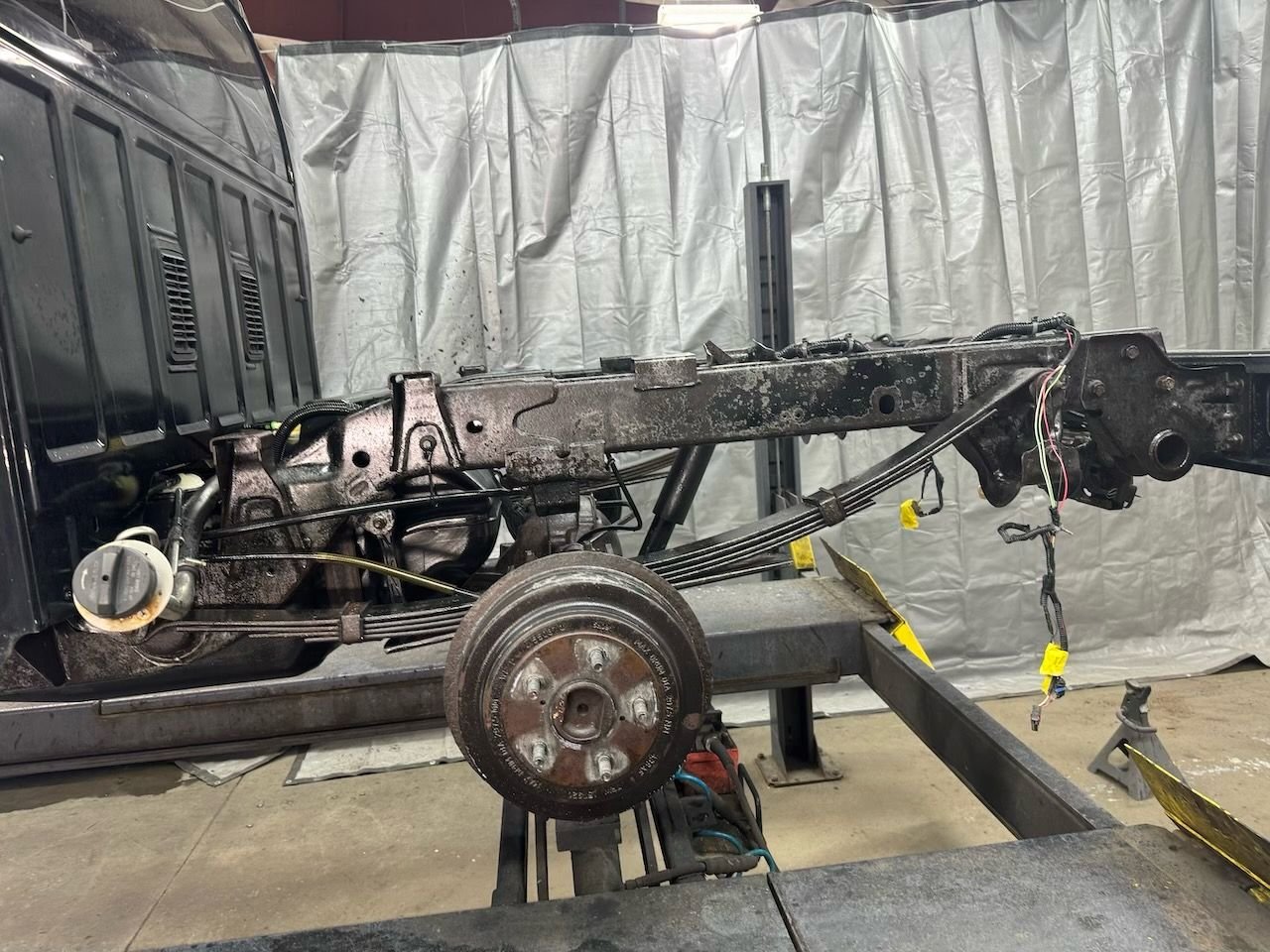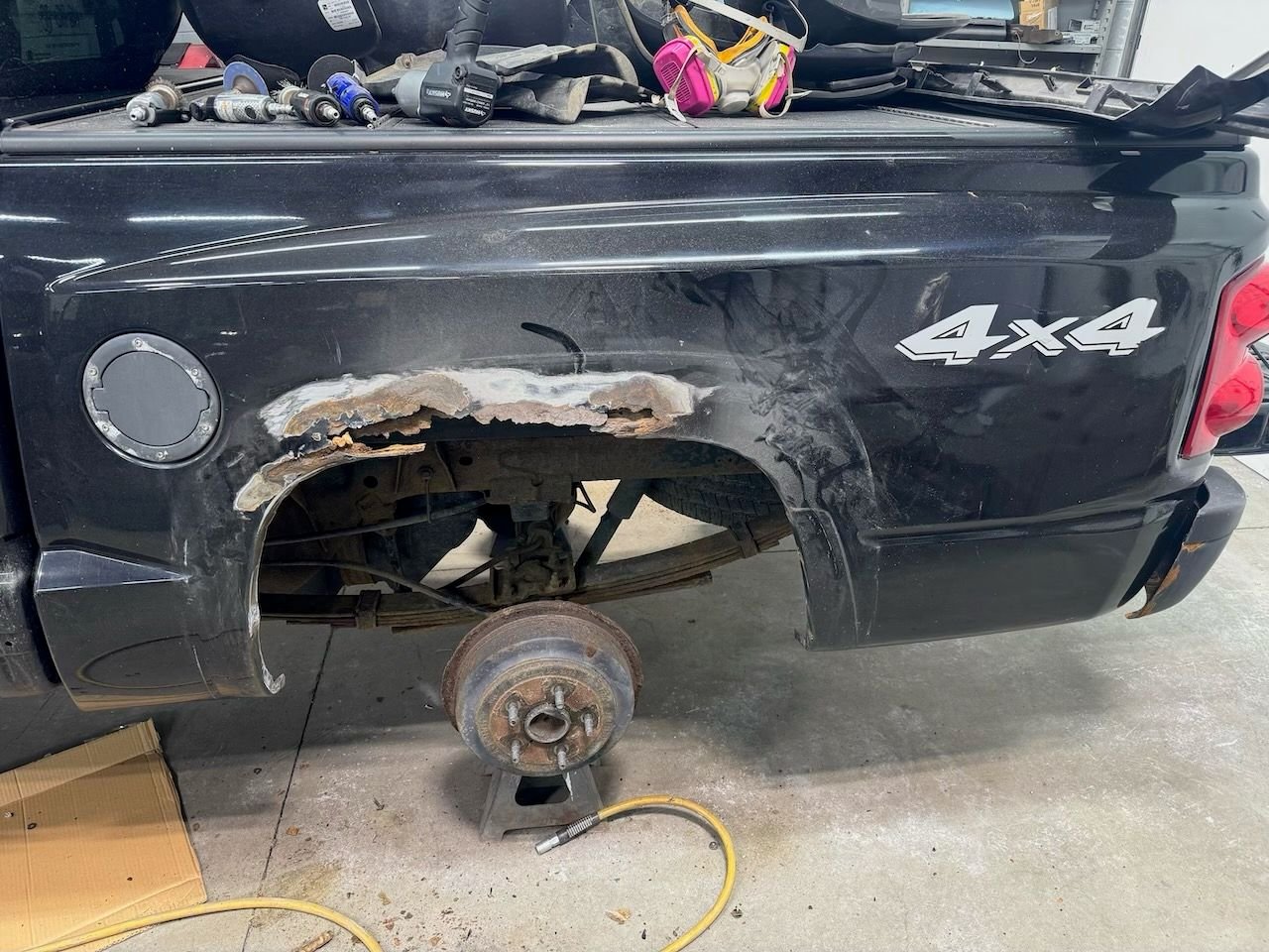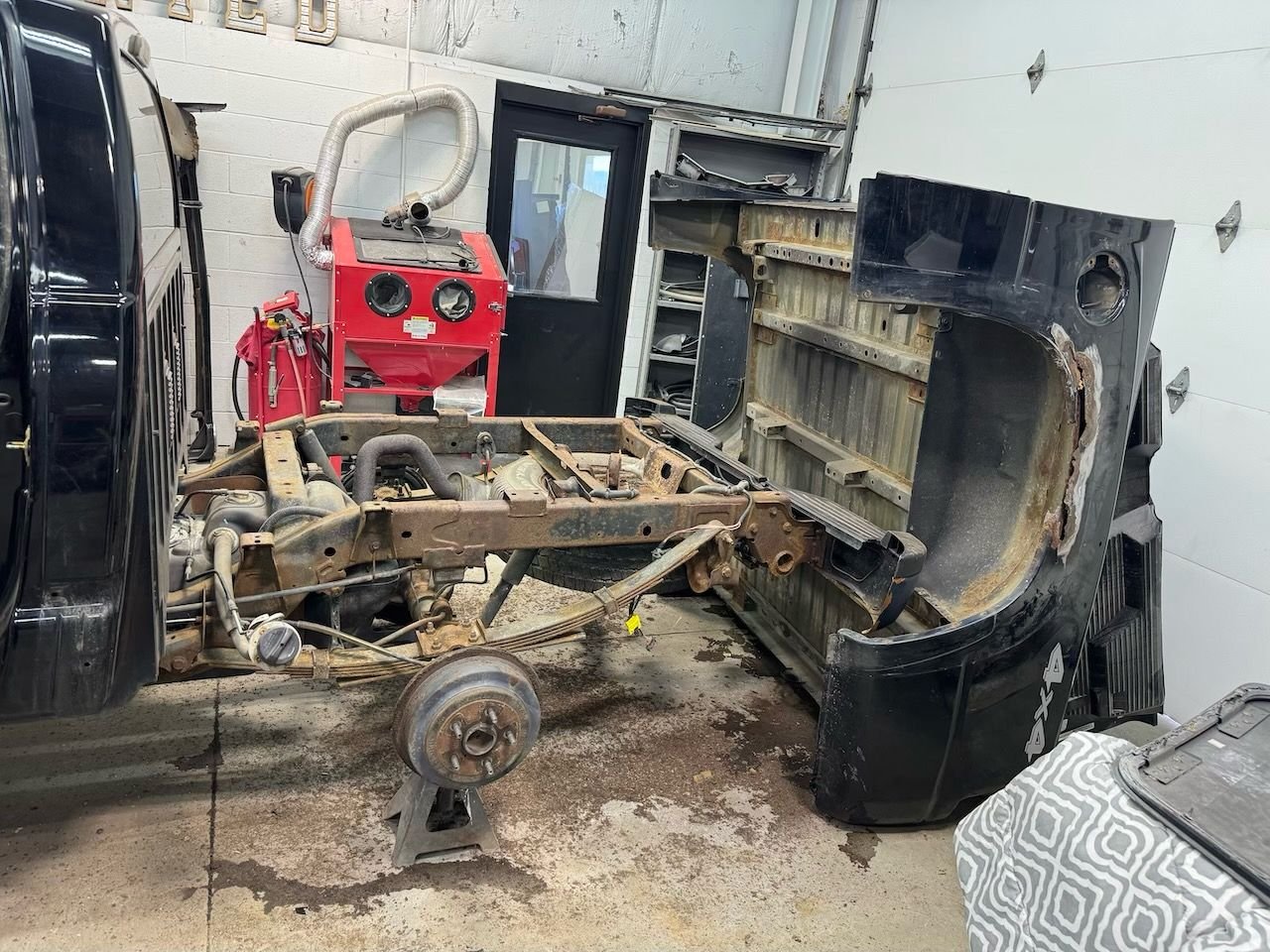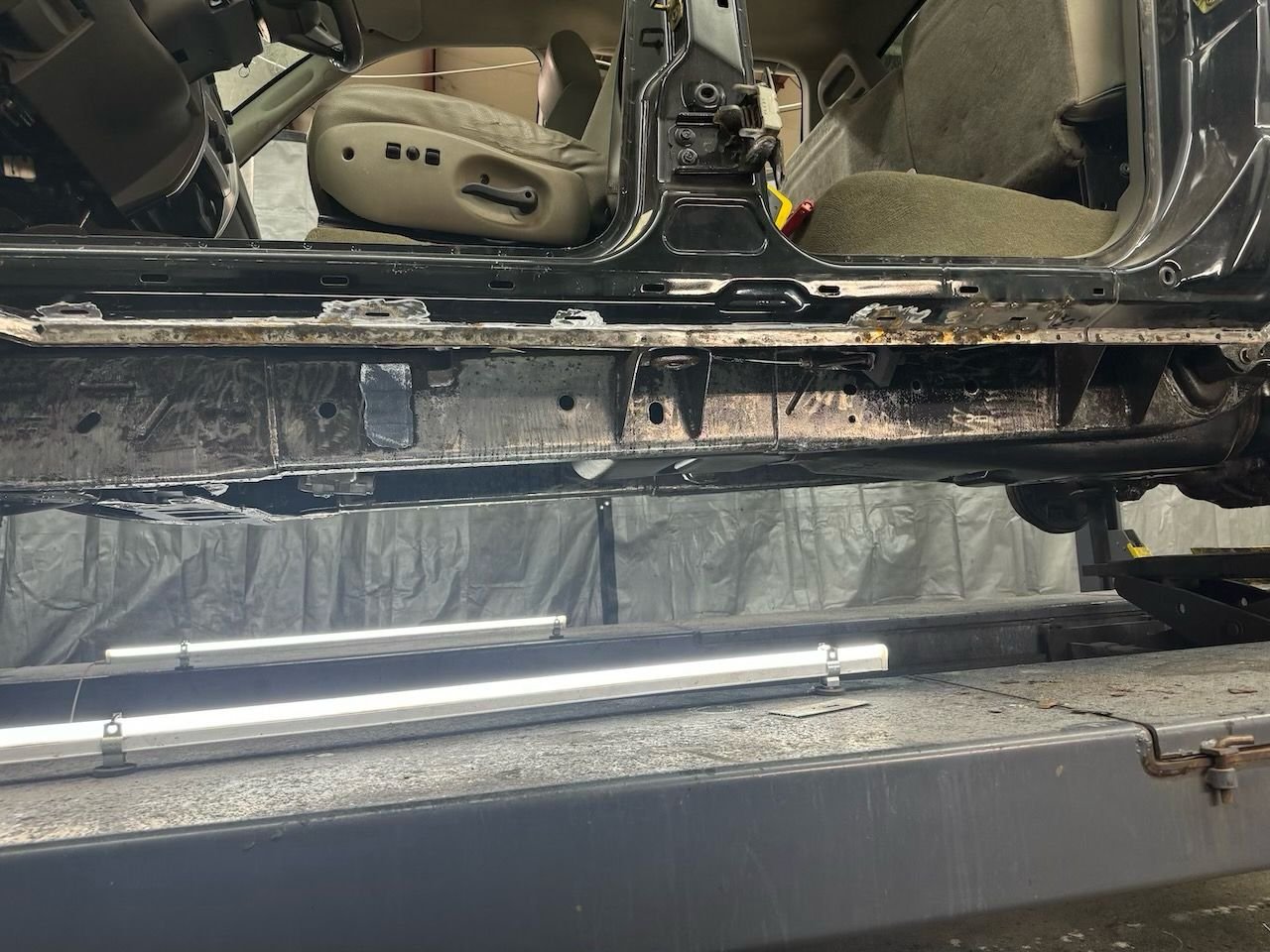 Day one Rocker rehab I feel like I should avert my eyes. The \"puddle" is rust... we're rehabing this frame. Post wire/needle/conversion Bed's cancer is too far gone The front looks less aerodynamic