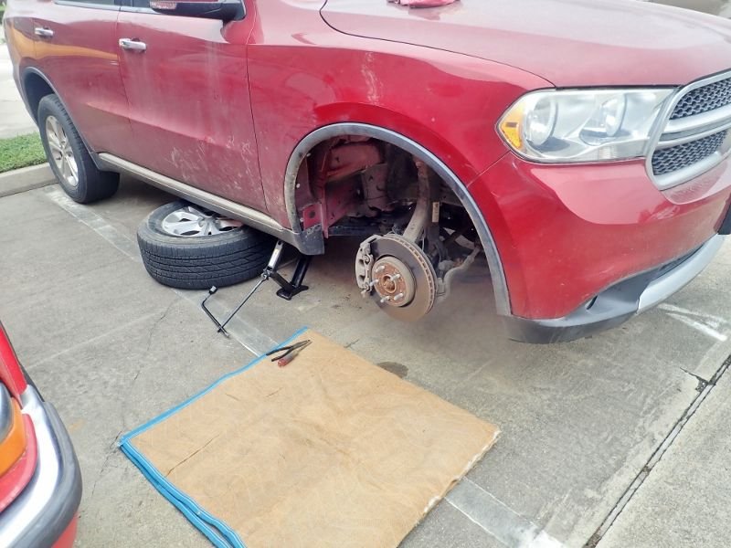 What's the shovel for? I never heard of a shovel being used for a car repair before. Well, you have now. The lug nuts were so darned tight that I couldn't budge them with the lug wrench. In fact, I was bending the wrench trying. Penetrating oil didn't help. I needed leverage, and I don't have a cheater pipe. I hooked the shovel blade under one side of the wrench, and the handle under the other side. That added about five feet of leverage. Snap! That was the sound of the lug nuts breaking free. It was so loud that I was afraid I had snapped the bolt off. Nope, everything was good.