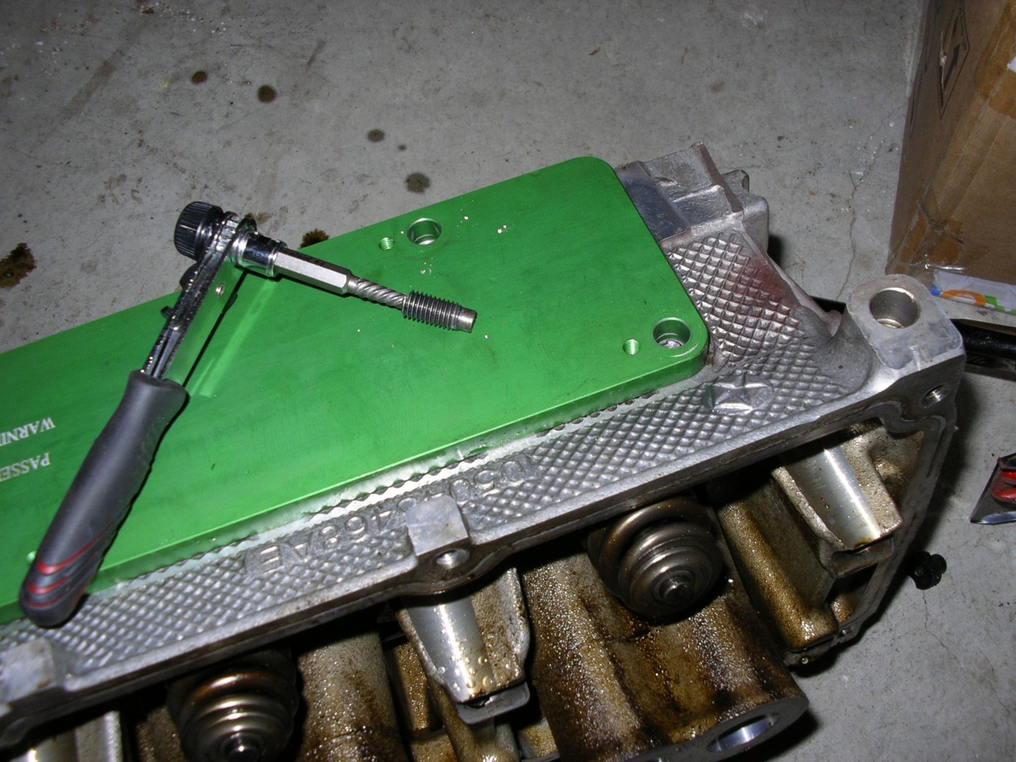 I used the kit with the heads off the car. I do know that you can get the green plate in there on the Rams going into the fender well. You can't do that on the Jeep/Durango suv's. I drilled (1/8th drill bit and guide) about 3mm into the studs and used one of the kits EZouts to first, lightly tap it into the hole, then with a ratchet, SLOWLY turn it out... Both of mine came out with no problems.