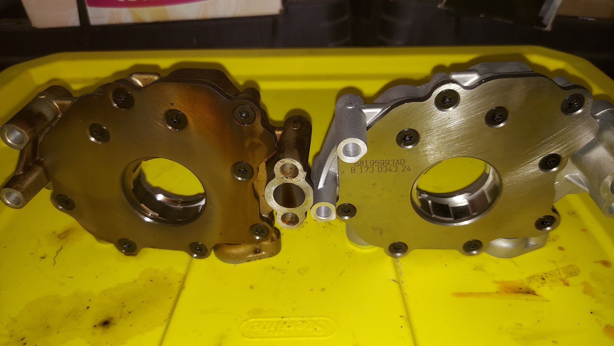 I had to replace the crushed front end. All I could find for a decent price was a front part with the chrome crosshatch. I am having it all repainted. Sadly, I found that I could have swapped the entire front end with the 2014-2019 for about $500 and kept the headlights. I do not care for the ones with the single LED. The 2024 I have has the dual LED. They look better but are not a direct swap to my auto adjusting factory projectors. Almost time to pull it. This engine ran but misfired. It was told to me that the oil pump had failed. More like the REAR main was just pumping it out the back. I would fill it up and it would have pressure. Not suddenly drip it all out the back... No shavings on the VVT and the rollers on the lifters (MDS) 5.7L were ALL good. Just the MDS solenoid (on the lower right) and misfire on cylinder 1.