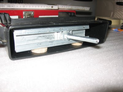I also had some metal rail from the kitchen remodeling (IKEA) that I mounted inside the box. Note that the square will ride in the rail and I can adjust the lateral position easily and whenever I want. I did cut a thread into the square and the positions is fixed with the screw.