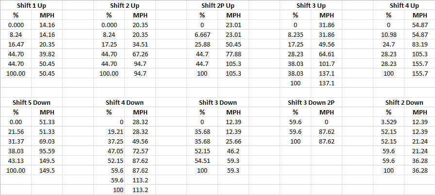 Looking at shift 1 up, would I be right in assuming that at 44.70% throttle position it will shift into second gear at 39.82 MPH? And if that's the case then why is it also shifting into second at 50.45MPH for the same throttle %.