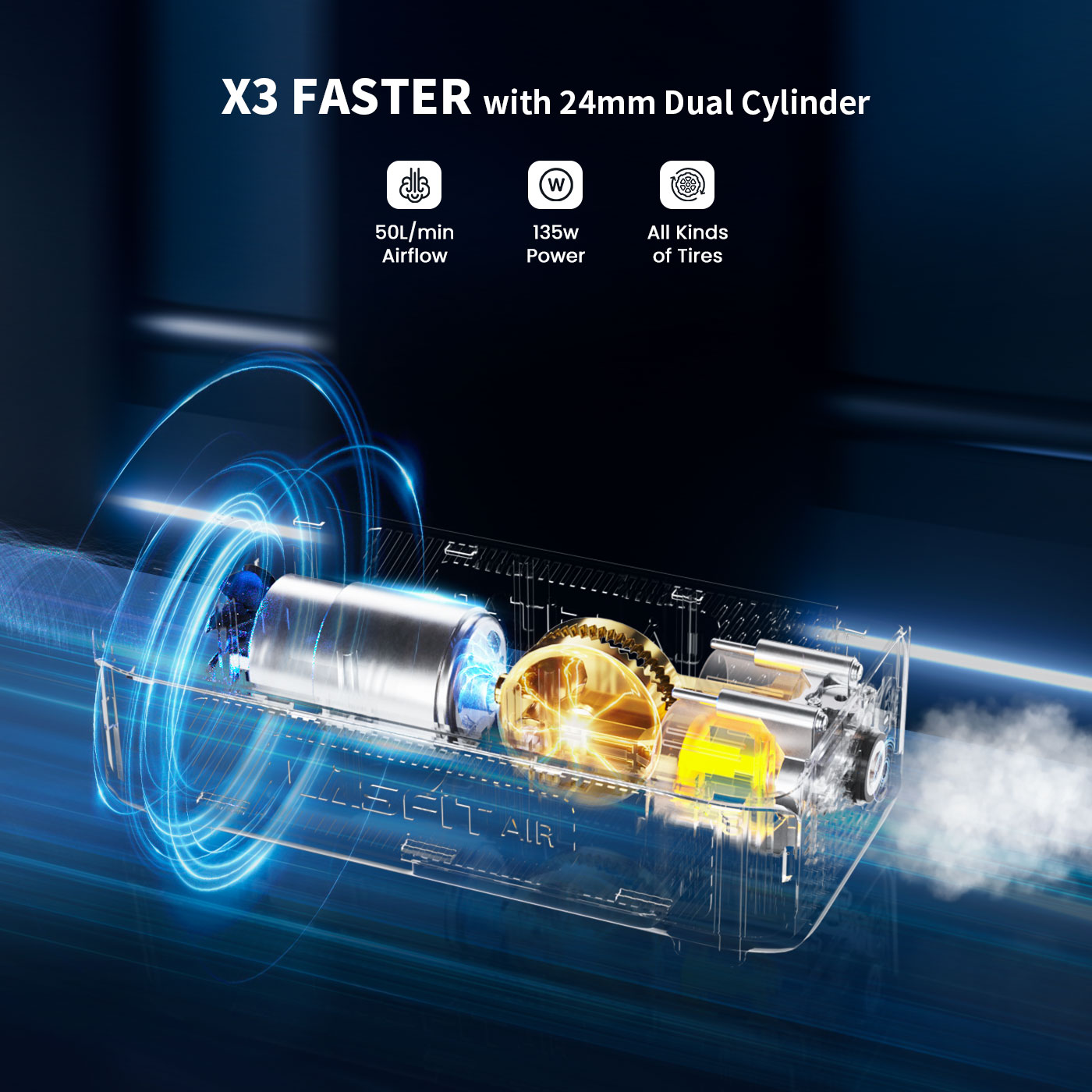 Powerful Inflation: Featuring an innovative dual-cylinder design, it achieves an impressive inflation rate of up to 50L/MIN, with a maximum pressure of 150PSI, inflate off-road tires in just 3 minutes.