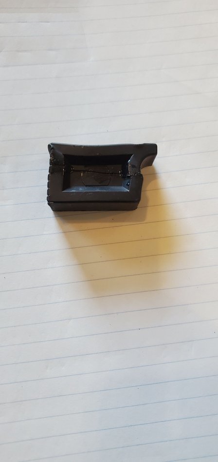 While I was jacking up the passenger front area to remove the tire, a part jumped out onto the floor. The part was cracked in half, of which I glued back together. Can anyone help identify it and where it came from? The part is approx 2" wide, 1.5" in height, and about a 1/2" thick. Looks like it might be used to hold some tubing in place.