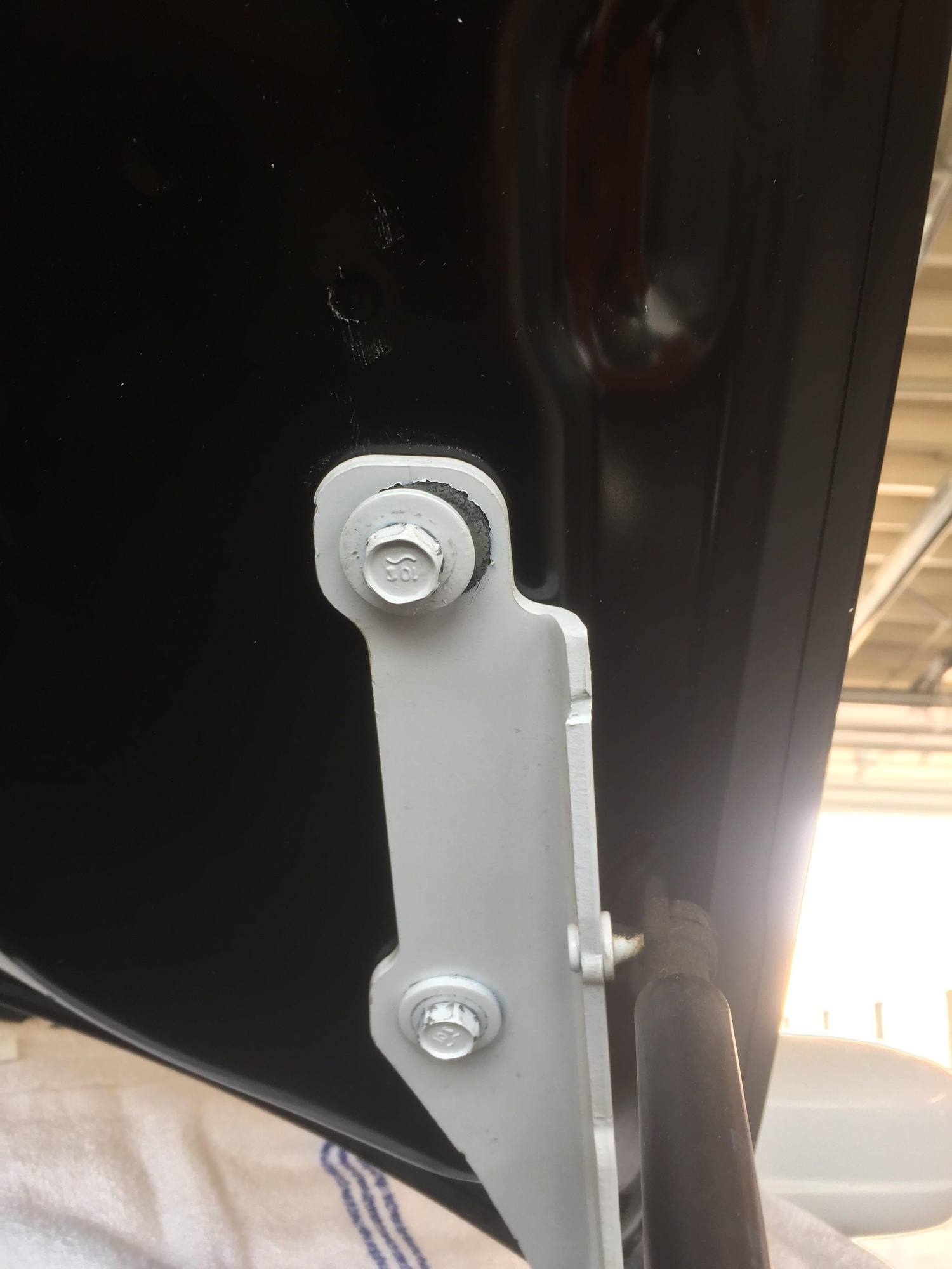 2) insert the 4 bolts that hold the hood to the strut bracket, do not tighten.