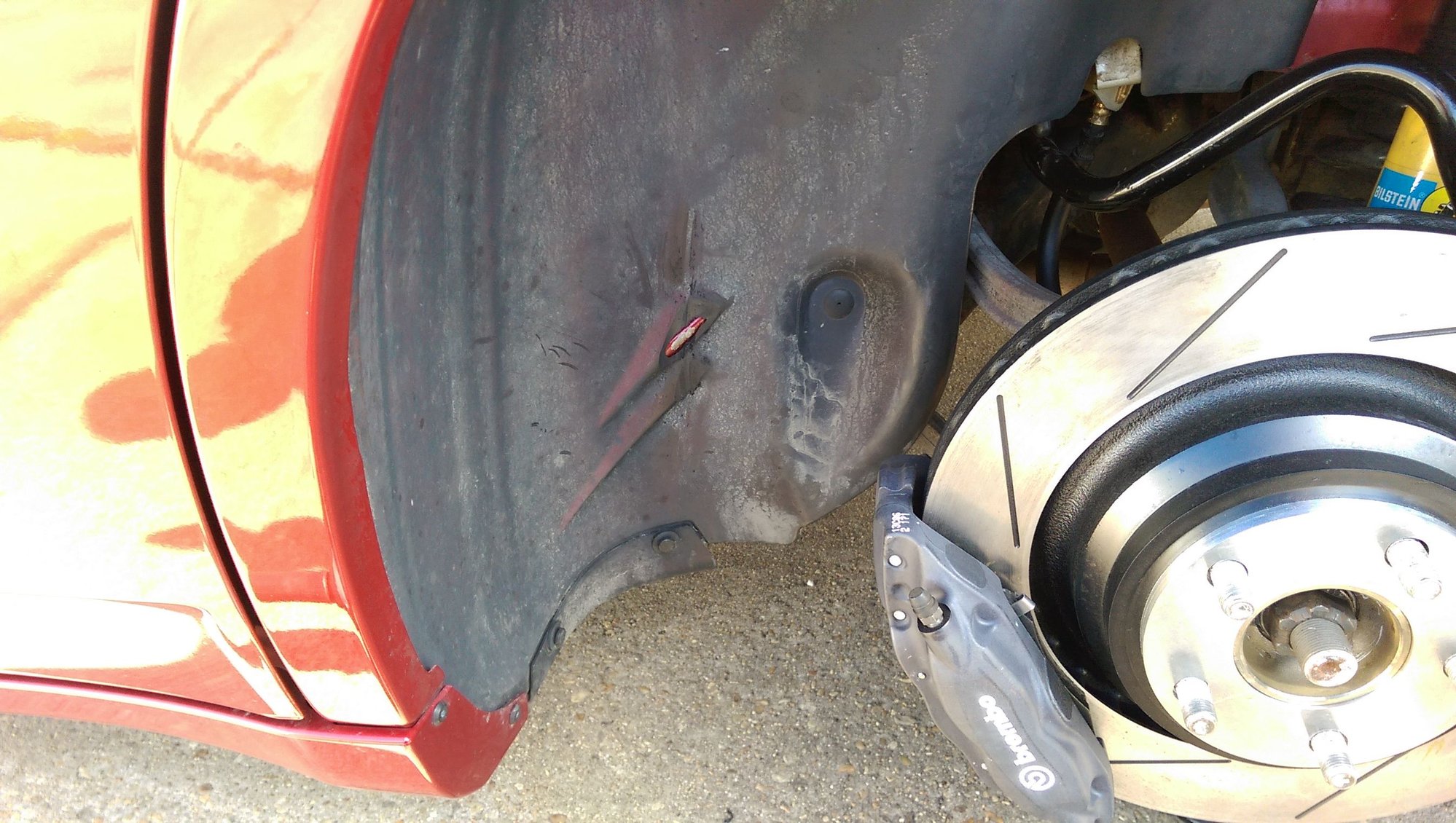 Mine doesnt hit on the inside. I jacked it up today and looked. Its the outside lip. It has cut into the outer edge of the tire. I guess the 305s are a bit big. Ill get 295s next time, but this is what I have now, so I have to deal with it. It only scrapes on my side, because Im in the drivers seat. With extra weight, like a passenger, it would probably be both sides. I rolled the fender lip a little, but I dont think it was enough. I might have to get taller rear springs. I forget who I got the coil overs from, but the rear springs were always really short. I put them as high as I felt comfortable, but the rear spring adjuster is maxed out, and the front springs have plenty to go. I could adjust this thing down probably another 2" if I wanted. Ill keep an eye on it, and maybe roll that fender lip again.