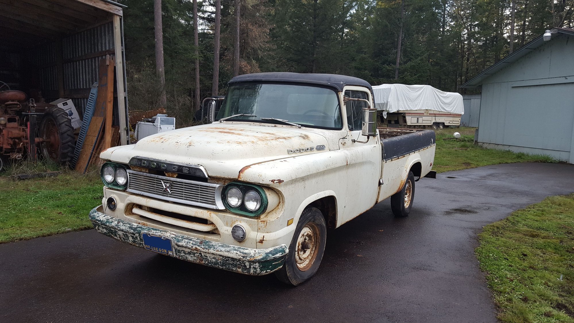 Yes it has the same body style as the 59 and after looking up the Power Giant series it has the same body lines and etc. It has a straight side bed not the step side and looks almost identical to this one. https://www.hemmings.com/blog/2019/0...60-dodge-d100/https://www.allpar.com/trucks/1960.html page also has some good info. Mine has 3 on the tree and is not in as good as shape. Interestingly enough it has the same exact camper shell which makes me wonder if it was a dealer option. It has had a hard life. The Odometer says 31 thousand but the peddle pads say other wise. I have not yet tried to start it but I could not get any compression in any cylinder with air pressure. The clutch and brake peddle is also stuck and I can not move the gear selector so I am working on that first before I can attempting to start. The ebrake work was because it was in the way of getting the brake and clutch peddle assembly out.