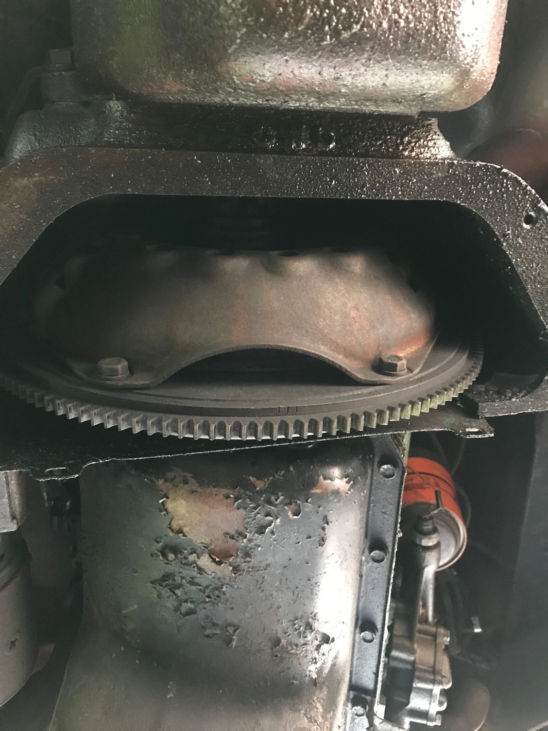 Also, underneath .... right behind the oil pan, it appears I'm missing a housing part. Not sure what it's called. (pic attached) Anyone know where I can get that cover/housing?