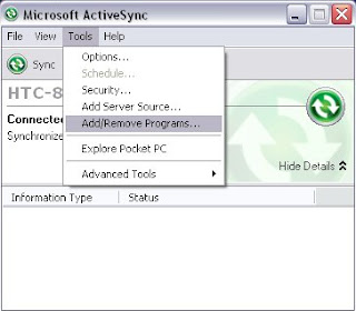 In order to remove a program that is installed on your phone, first connect the phone to your computer. Upon plugging the phone in, the Microsoft ActiveSynch window should appear. Choose "Tools" the "Add/Remove Programs" as shown in the screenshot below.