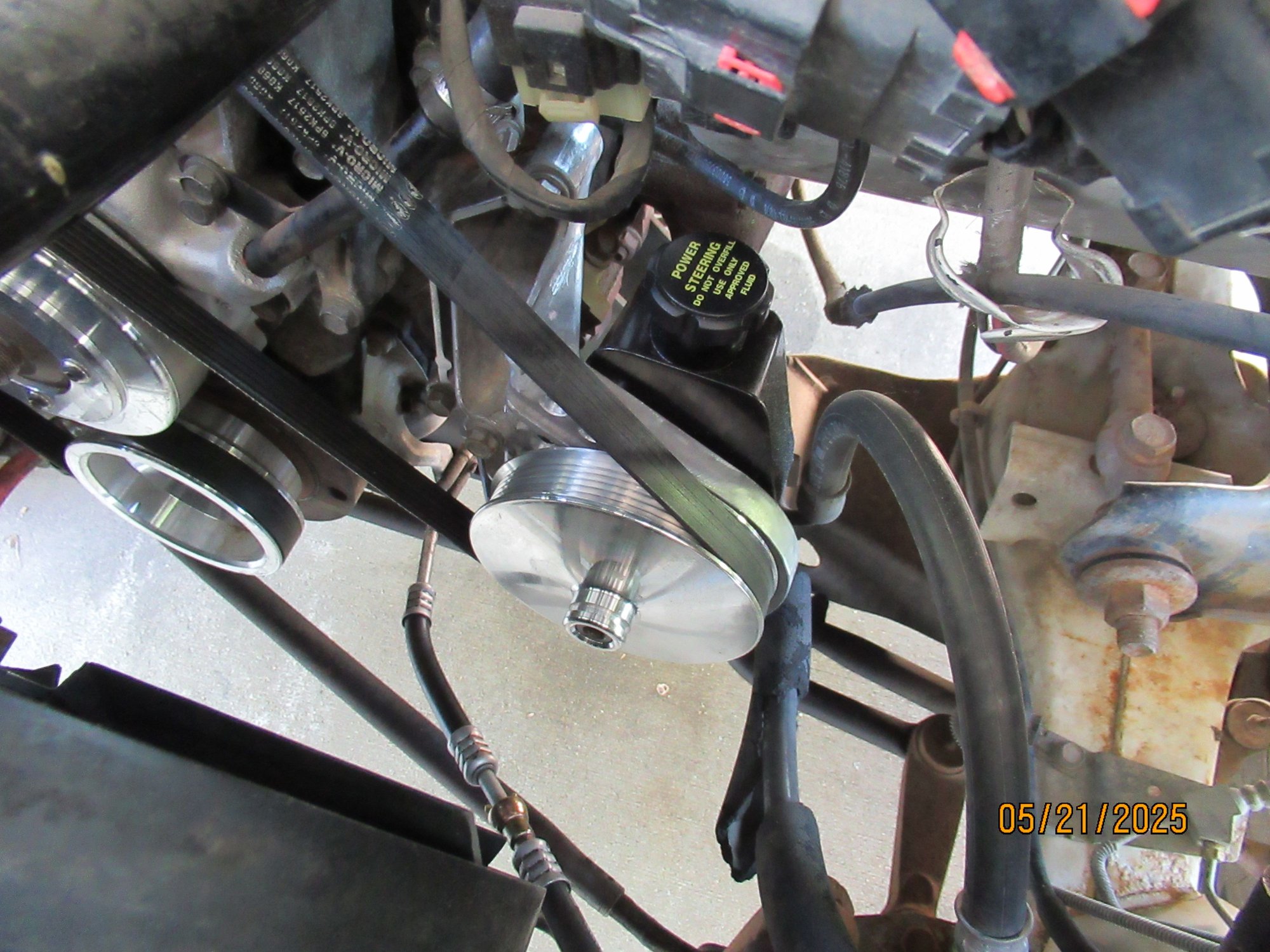 The install of the PS pulley was more involved than it should have been. I had noticed that the original pulley wan't on all the way and thought that a little odd and then while trying to get the pulley off it wasn't going to be straight forward as it was very tight. I also noticed there were no threads to use to put the new pulley on. I though it was just a mud robbers nest and got a pick to clean it out. What was in there was alot harder than a mud nest so I took the whole pump off and found they had broke the bolt off while installing the pulley which happened to have a made in china notification and they evidently didn't get the ID right. Luckily the bolt just spun right out. Getting the pulley off was time consuming and a strain. Every time it moved it was with a pop and it took alot of pressure to get it to move, but it finally relented and came off. Install of the aluminum pulley was easy and nothing broke. Took this time to flush the entire power steering system with Amsoil synthetic fluid using the steering box as the pump moving the steering wheel side to side. Worked very slick.